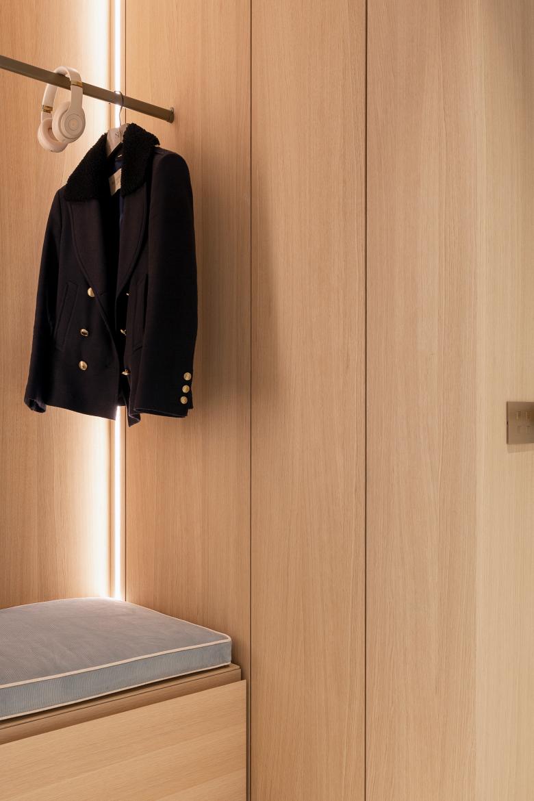 The tailor-made, built-in furniture and loose furniture, combined with modern designer pieces, are unique. The special feature is the built-in cabinets made of natural oak and covered with the finest linen. All of the wardrobes are specially designed to meet the needs of the client, so that every item of clothing finds its specific place, from coat to shoes to belt.