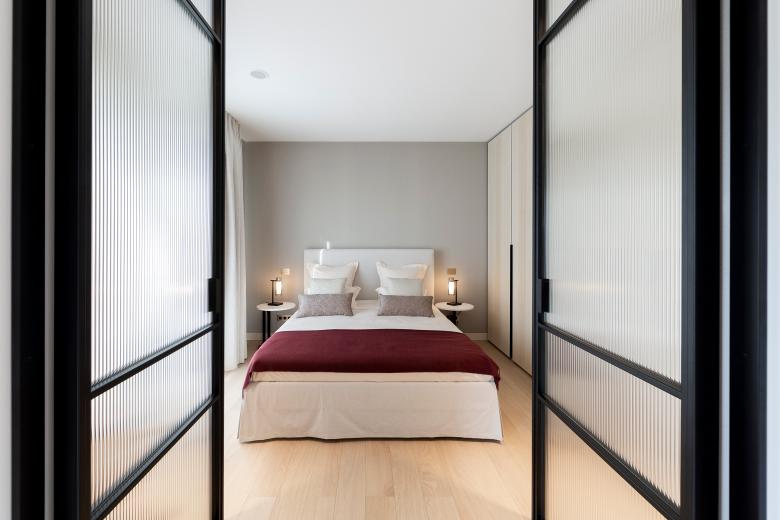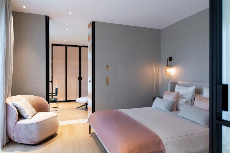 The floor-to-ceiling doors, which allow or prevent glimpses into the various rooms depending on their use, are striking. This was created through the choice of materials, which ranges from transparent glass, corrugated glass, metal mesh to hand-painted wallpaper.