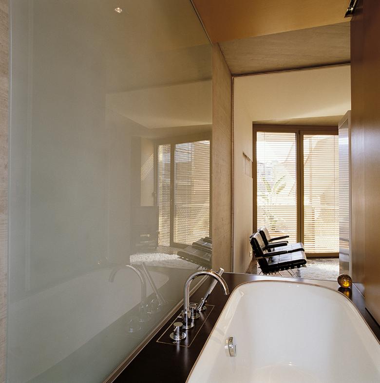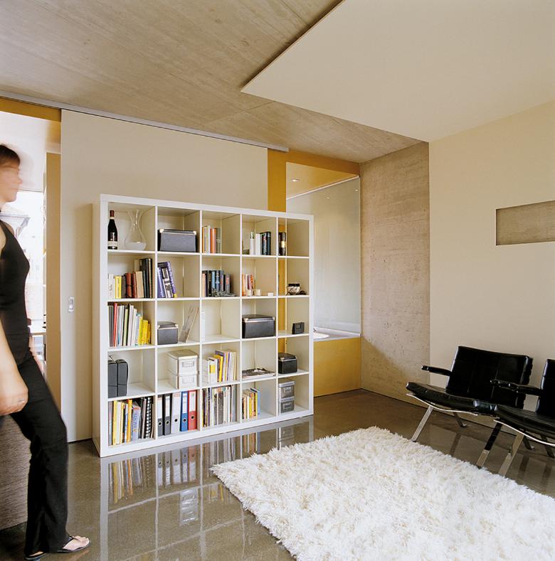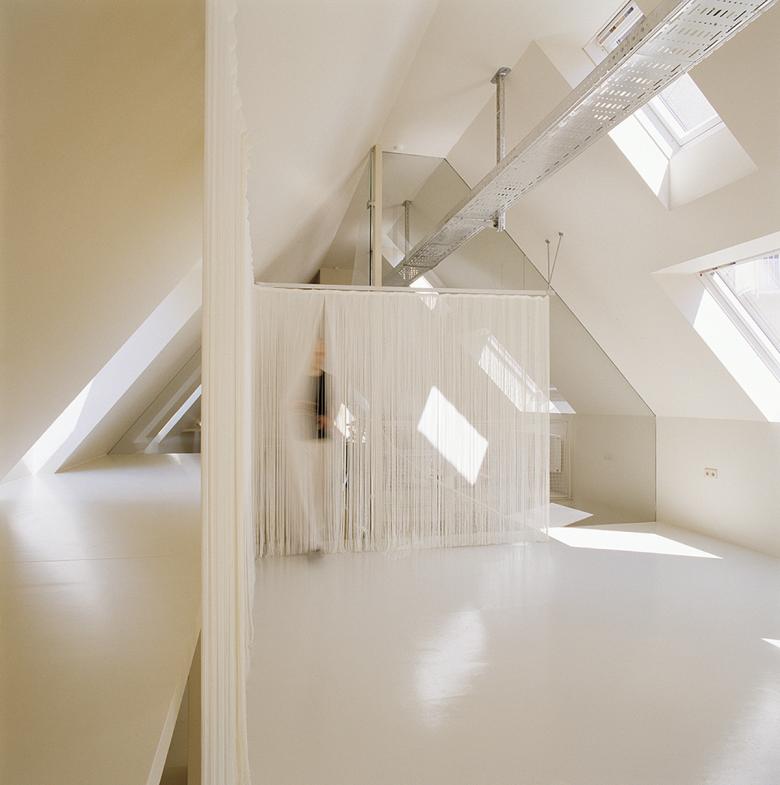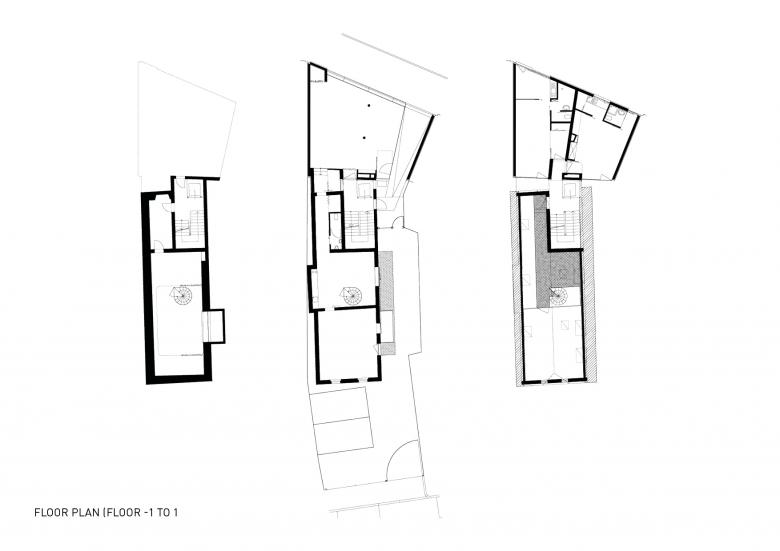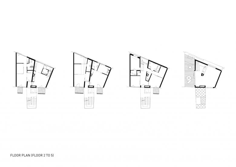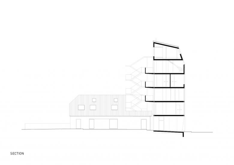 Die ersten drei Ebenen beherbergen die Büroflächen von INNOCAD und 13&9 Design mit fünf Wohnungen in den Obergeschossen. Die nach innen gerichteten, geschlossenen Bereiche werden durch ihre Geschichten zu einem komplexen Körper verbunden, der zwischen den Brandwänden schwebt.