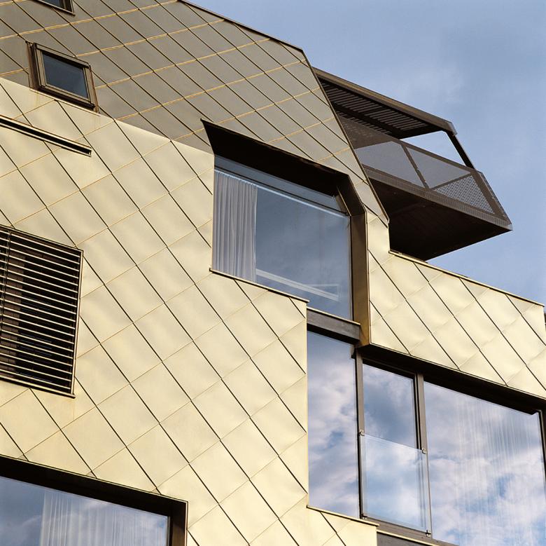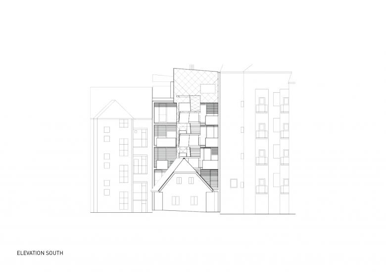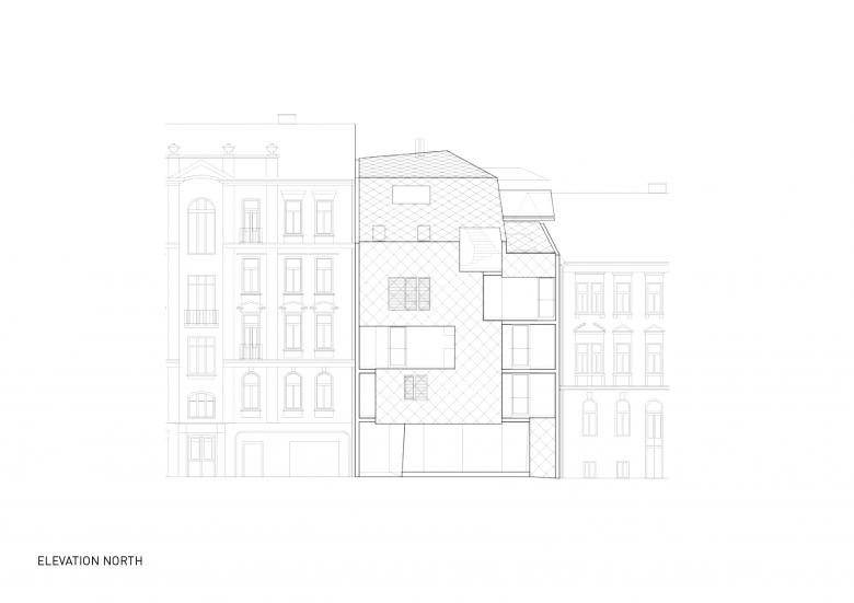 Semitransparente Leichtbauplatten bilden die Fassade, die von den benachbarten Gebäuden aus dem 19. Jahrhundert gedämpft wird und einen visuellen Bezug zur Umgebung herstellt. Es wurde darauf geachtet, dass der Übergang an der Gebäudekrone zwischen den unterschiedlichen Dachhöhen der Nachbargebäude von einer differenzierten Gestaltung profitiert, die die Gebäude durch eine durchgehende Silhouette integriert.
