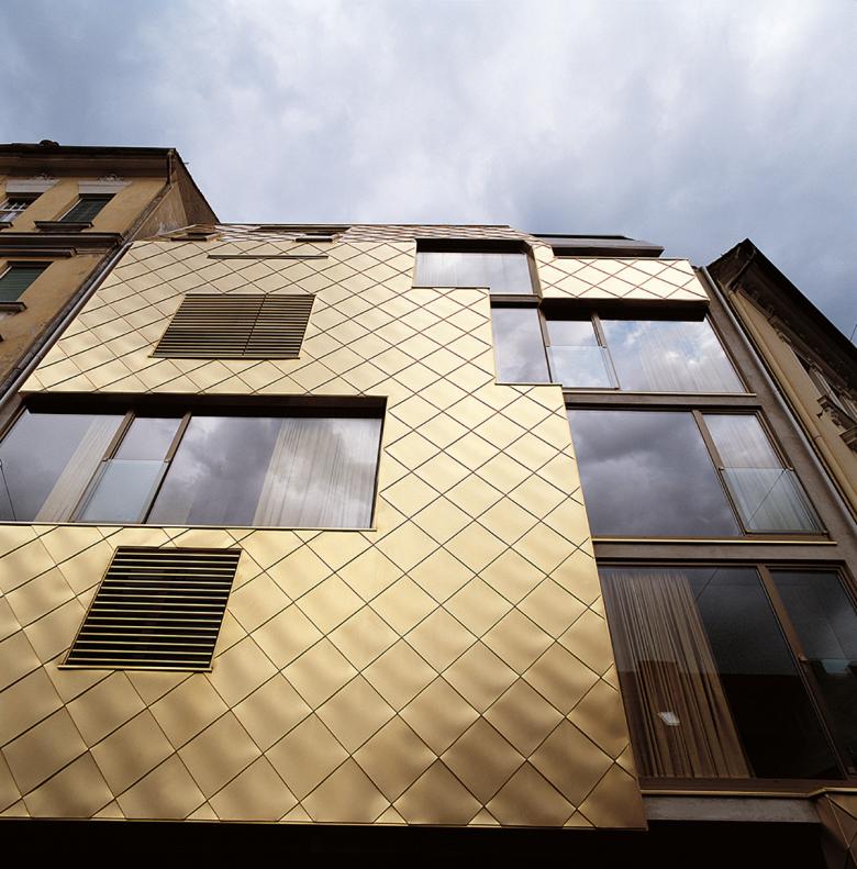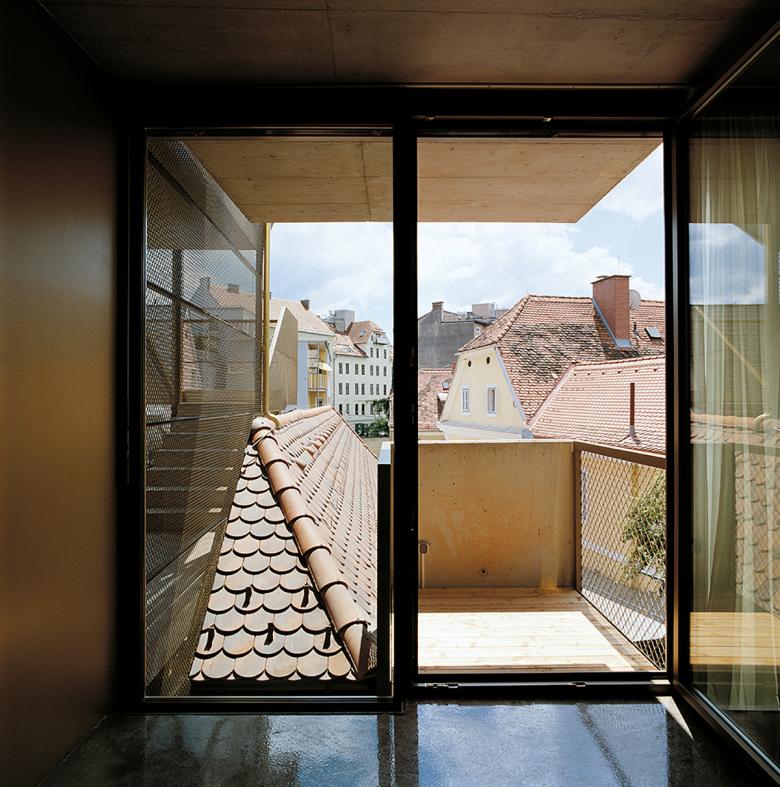 Der Altbau wurde gemäß ASVK-Erhebung hofseitig erhalten und saniert und ist sowohl funktional als auch formal in das Gebäudeensemble eingebunden. Das aus der Fassade ragende Treppenhaus, wie bei den Nachbargebäuden, soll nicht geschlossen werden, sondern ist als filigrane Spiralskulptur ohne Seitenwände oder Stützkonstruktionen ausgeführt und erreicht so maximale Transparenz.