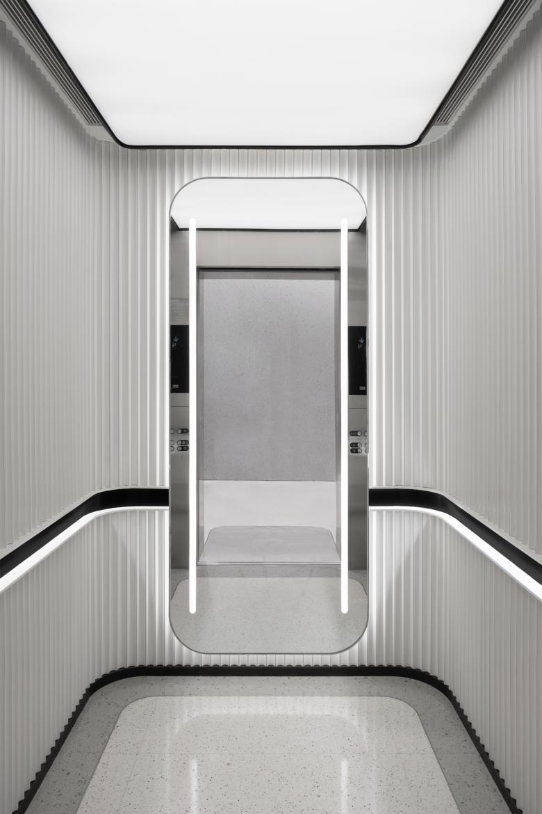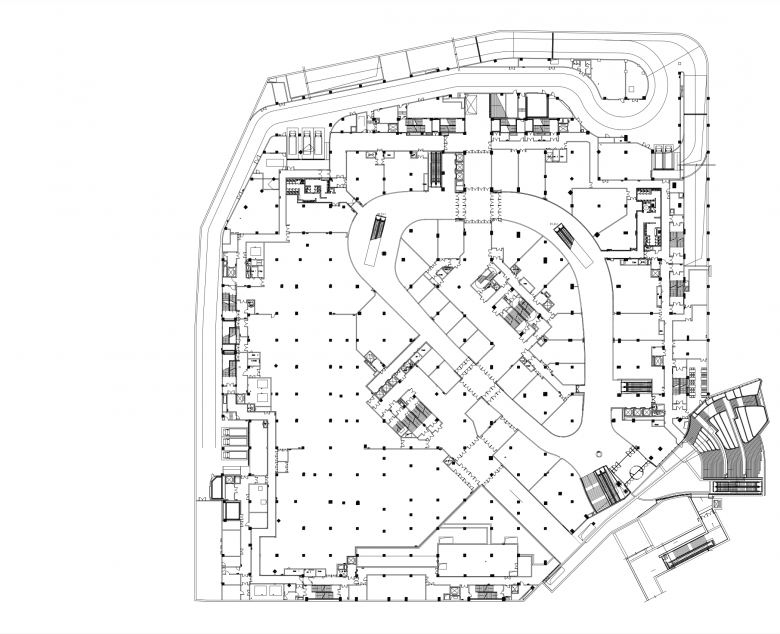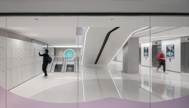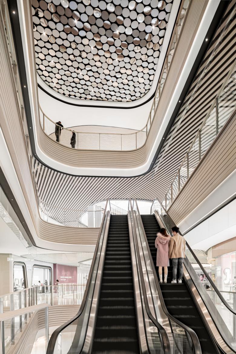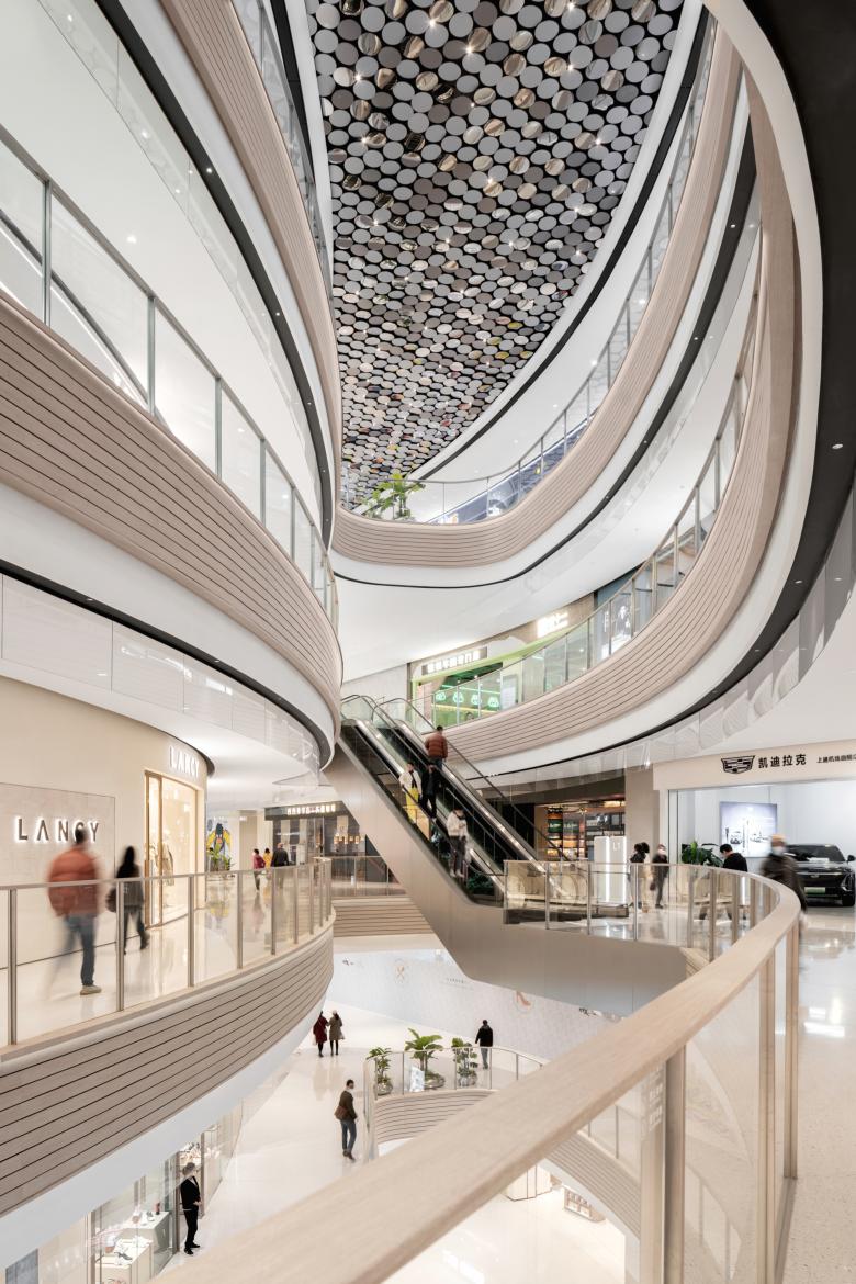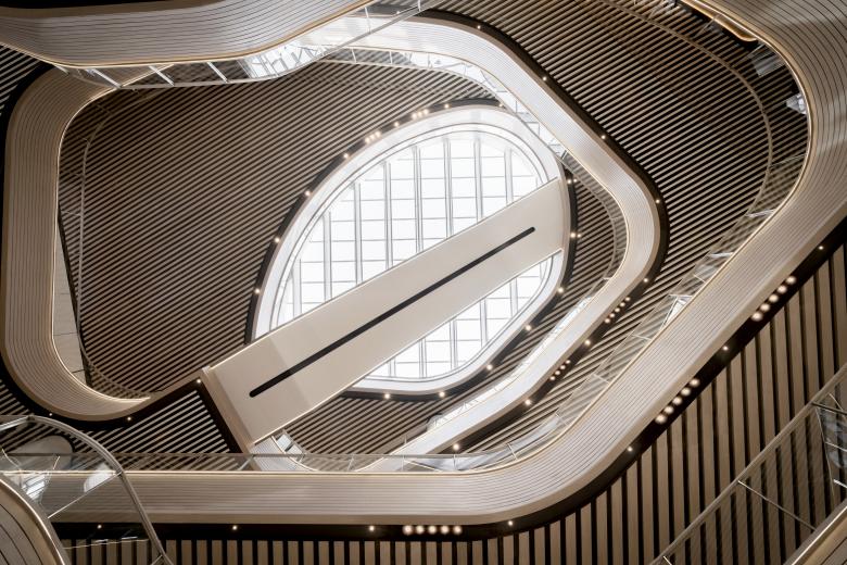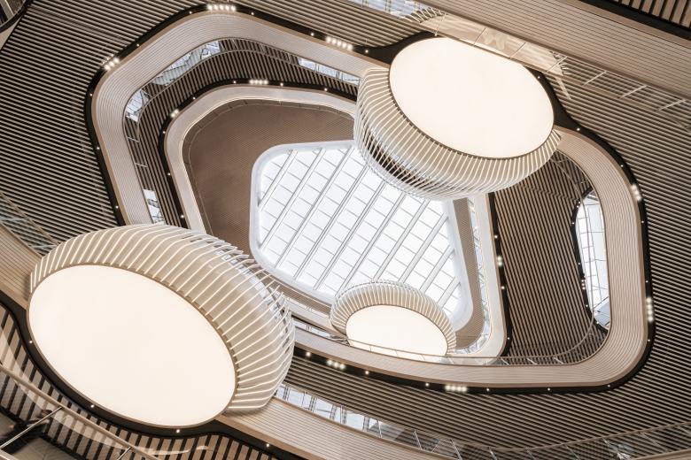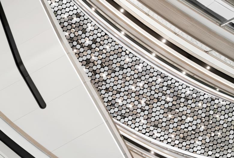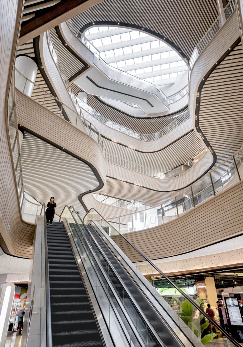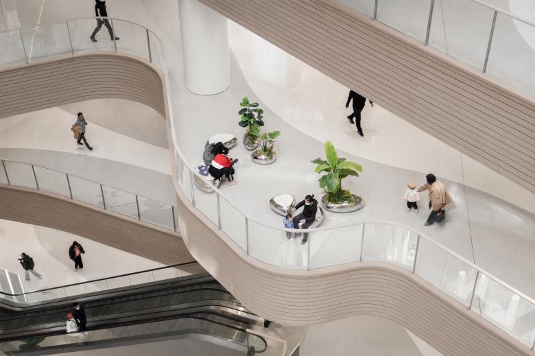 Visuelle Highlights der Mall sind die beeindruckend großen Atrien, die dank großzügiger Oberlichter von natürlichem Licht durchflutet sind. Die einzelnen Ebenen sind in organischen Formen vielfältig um den Luftraum modelliert. So schichten sich die Atrien wie die unregelmäßigen Versprünge einer Felsinsel in die Höhe. Gleichzeitig entstehen auf den verschiedenen vertikalen Niveaus Sichtbeziehungen zwischen den Galerien, die die Besucher:innen neugierig machen und sie animieren, das Gebäude zu erkunden. Die gesamte Mall erscheint so als großer skulpturaler Raum, der klar und übersichtlich wirkt und zugleich überrascht.