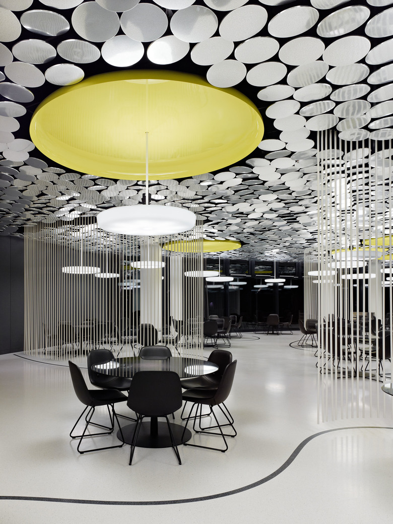 Die Decke bietet auch funktionale Vorteile: Der Bereich über den Deckentellern wurde samt der notwendigen Haustechnikinstallation schwarz ausgeführt und damit unsichtbar, Drallauslässe und Sprinkler verschwinden visuell. Die Oberdecke wurde zusätzlich schallabsorbierend ausgeführt, um die mikroperforierten Teller in ihrer akustischen Wirkung zu ergänzen.