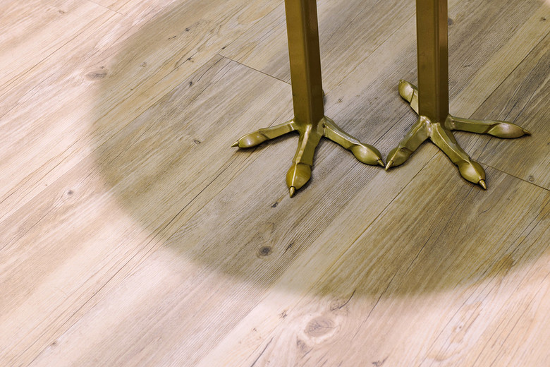 Vor dem Tresen offeriert eine Servicestation aus weißem Mineralwerkstoff Soßen, Gewürze und Besteck. Diese steht auf goldenen Hühnerbeinen und schaut wartend in Richtung Eingang. Im durchgehenden Boden in rustikaler Holzoptik weisen in Wienerwaldgrün eingelassene Hähnchen und Hinweise dem Kunden den Weg durch den Bestellprozess.