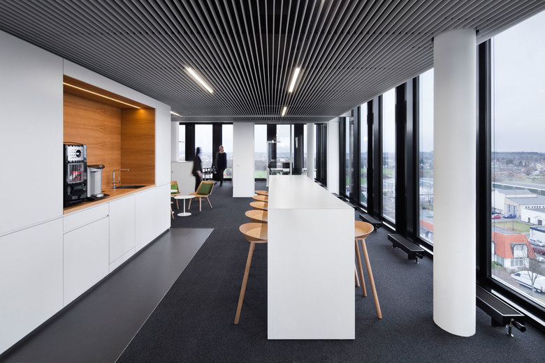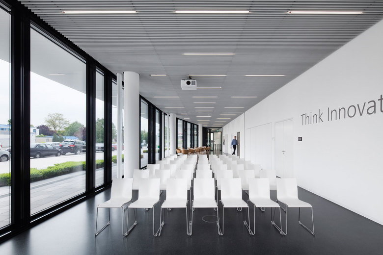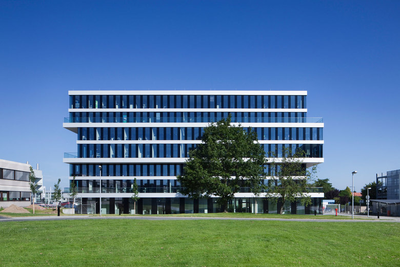 Das neue Bürogebäude bildet den neuen Eingangsbereich zum Grünenthal-Campus und schafft gleichzeitig eine moderne, kommunikative und flexible Arbeitswelt für rund 200 Mitarbeiter. Die sieben leicht versetzt zueinander liegenden Geschossdecken prägen nicht nur das markante Erscheinungsbild des Hauses. An den beiden Längsseiten des Gebäudes liegen die natürlich belüfteten und belichteten Büroarbeitsplätze, die flexibel an neue Anforderungen angepasst werden können. Darüber hinaus entstehen in der Mittelzone der Büroetagen zusätzliche Flächen für Kommunikation und Informationsaustausch, wie z.B. Meeting-Areas, Coffee-Points, Lounges, Archive oder Copy-Inseln. Die drei durch das Verschieben der Etagen entstehenden Terrassen im Außenraum eröffnen weite Ausblicke auf den Campus oder in den Aachener Landschaftsraum.