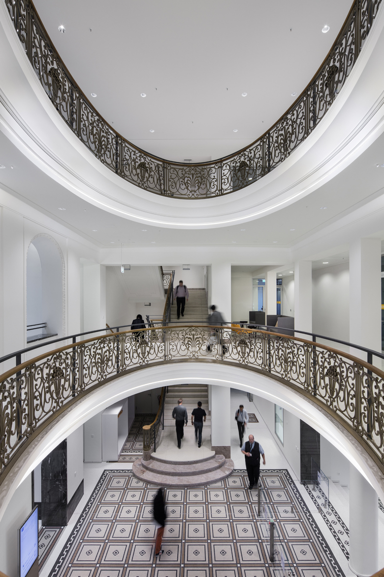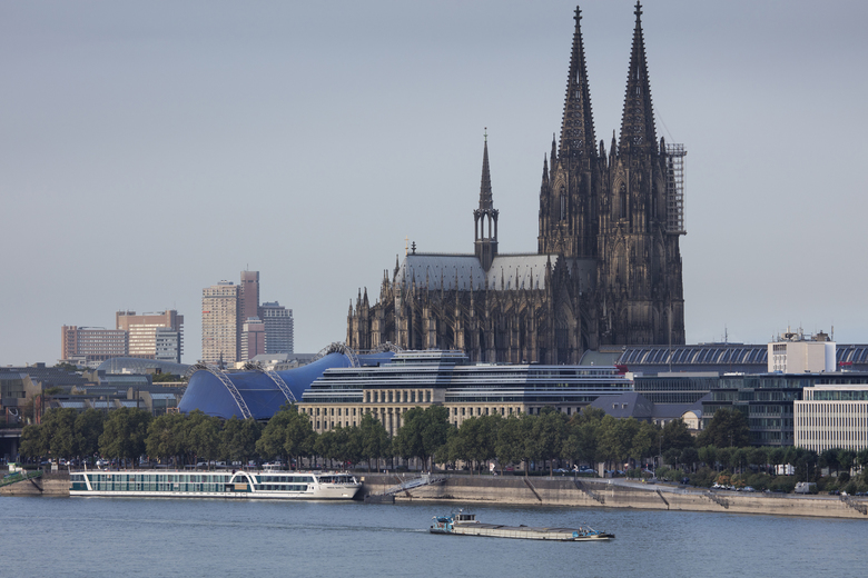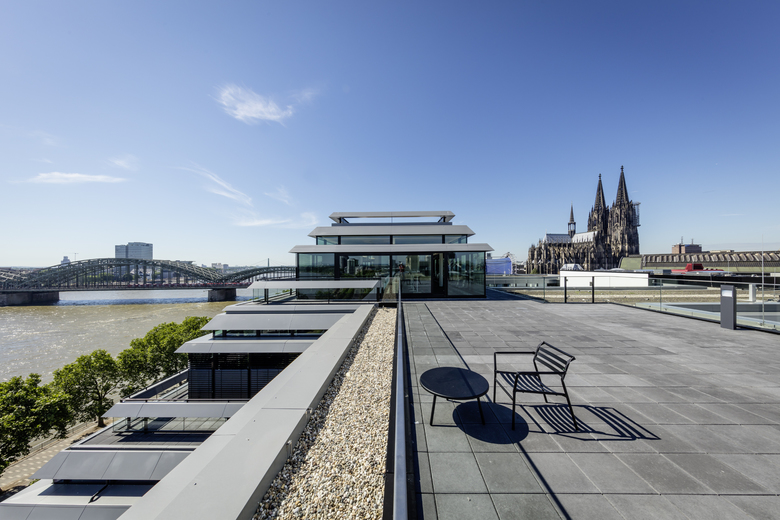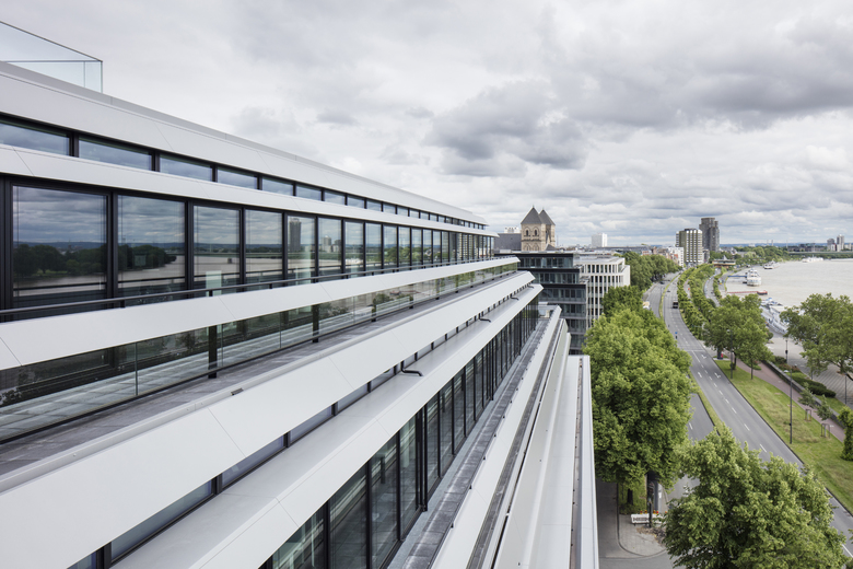 Die ehemalige Bahndirektion liegt am Konrad-Adenauer-Ufer vis-à-vis zum Rhein und in unmittelbarer Nähe zum Kölner Hauptbahnhof. Der Entwurf berücksichtigt den denkmalgeschützten Bestand sowie das historische Fassadenbild und entwickelt eine zeitgemäße Lösung für das im zweiten Weltkrieg zerstörte Mansarddach. Metallene Bänder umhüllen die insgesamt vier Dachgeschosse und zeichnen mit ihrer Neigung die historische Dachkontur nach, die lange Zeit die Rhein-Silhouette der Domstadt prägte. Die hinter den Bändern liegende Glasfassade folgt nicht der ursprünglichen Dachschräge, sondern steht orthogonal zu den Geschossplatten. Im umlaufenden Fassadenzwischenraum entstehen Dachterrassen mit atmosphärischem Mehrwert und einem Panoramablick auf die Stadt. Die denkmalgeschützte Fassade der unteren vier Geschosse wird aufgearbeitet und umfassend saniert; die imposante, historische Eingangshalle wird originalgetreu in den Neubau integriert. Drei erdgeschossige Hauptzugänge am Konrad-Adenauer-Ufer ermöglichen eine Aufteilung in verschiedene Mietbereiche. Diese erfüllen alle Anforderungen an moderne, flexible Büroflächen, die vom Zellenbüro bis zum Businessclub alle gängigen Arbeitsplatzkonzepte abdecken können.