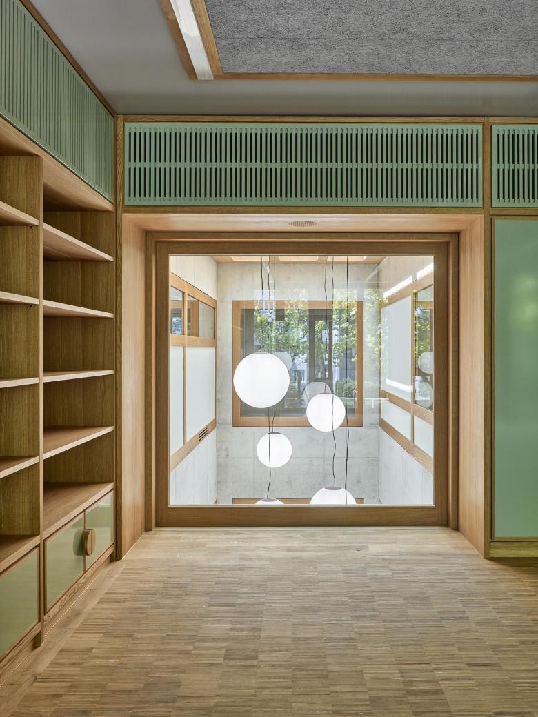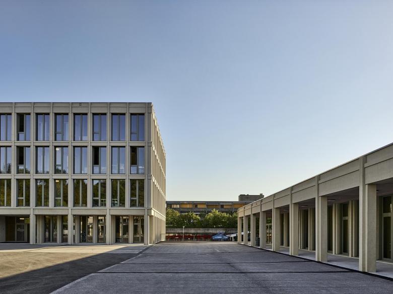 Das Projekt ersetzt mit zwei Volumina eine Schulanlage aus den 1970er-Jahren im Stadtquartier Kleefeld in Bern. Zusammen mit der bestehenden Turnhalle und dem benachbarten Quartierszentrum „Chleehus“ bildet der Ersatzneubau das Herz der Wohnsiedlung. Der zentral geplante Pausenplatz hat durch seine offene Westseite Bezug zum Quartier, womit er sich neben der Schulnutzung auch als Begegnungsort eignet. Die beiden Neubauten bilden durch das abfallende Terrain natürlich belichtete Sockel aus, welche die unabhängige Erschliessung verschiedener Nutzungen ermöglichen. Im flachen Volumen erhält die Basisstufe im Sockelgeschoss freien Zugang zum südöstlich gelegenen Aussenbereich, während sich die im Erdgeschoss angeordnete Tagesschule zum Pausenplatz orientiert. Die von hier aus erschlossene Primarstufe funktioniert unabhängig vom Konservatorium, das separat von der Nordseite her erschlossen wird. Die Schulgeschosse sind als überschaubare Cluster organisiert, in denen jeweils vier aussenliegende Klassenzimmer mit Gruppenräumen und ein zentral liegendes Lernatelier kombiniert werden. Als Massivbauten geplant, ist das Innere der Gebäude durch Sichtbeton geprägt, den hölzerne Wandverkleidungen und Einbaumöbel ergänzen. Die aus Betonelementen gefertigten Fassaden nehmen Bezug auf die Ästhetik der umliegenden Bauten der 1970er-Jahre, der Ausdruck wird jedoch durch die schlanke Profilierung und die sandgestrahlte Oberfläche der Elemente veredelt. Eine leicht unterschiedliche Farbgebung differenziert die Gebäudesockel von den Obergeschossen subtil voneinander.