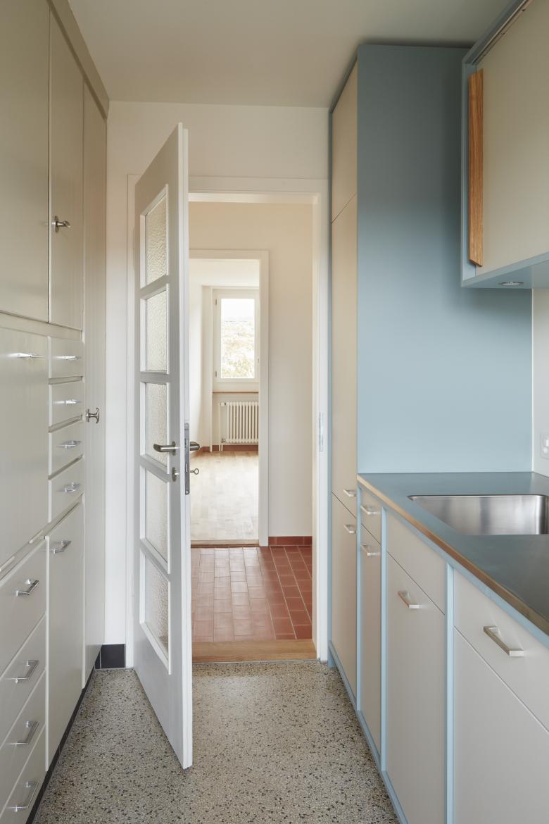 Die Gestaltung sämtlicher neuer Bauteile erfolgte im respektive passend zum Stil der 50er-Jahre. Werthaltige Bauteile wie die raumhohen Küchenschränke, die Küchentüren mit Kathedralglas oder die bestehenden Absturzsicherungen wurden sorgfältig saniert und den heutigen Bedürf¬nissen angepasst.