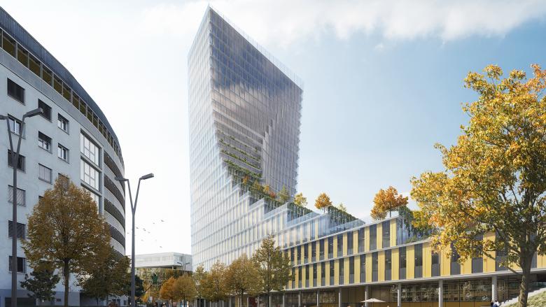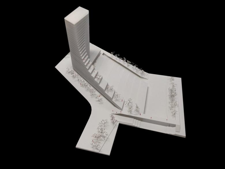 Das Hochhaus in seiner Lage am Übergang des Stadtraums zum Erholungsraum Donau formuliert eine klare vertikale Fassade zur Stadtseite aus und erzeugt eine landschaftsartige, abtreppende Geste zur Donau hin. Diese Abtreppung ermöglicht ein Reagieren auf die benachbarte Bebauung: Gute Belichtung und freie Sicht für die Wohnbebauung am Marathonweg und die Aufnahme der Maßstäblichkeit des Gasthaus Mehler.