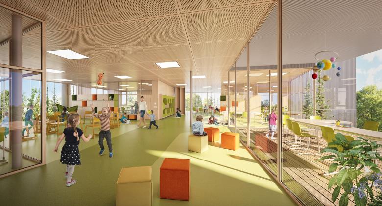 Der Lernkiez ist modular in verschiedene „Compartments“ unterteilt, die als kleine Schulen in der großen Gemeinschaftsschule fungieren. Diese klare Raumstruktur bietet den Schülern Orientierung und fördert individuelle Lernformen. Flexibel nutzbare Lernlandschaften, Rückzugsorte und offene Foren schaffen Raum für Projektarbeit, kreative Unterrichtsformen und soziale Interaktion. Alle Räume sind so konzipiert, dass sie durch eine zweiseitige Belichtung und Querlüftung optimal nutzbar sind. Zudem verzahnen sich die pädagogischen Räume mit den Außenbereichen wie dem Schulgarten, Sportpark und verschiedenen thematisch gestalteten Freiflächen, die die Nutzung der Natur in den Lernalltag integrieren.