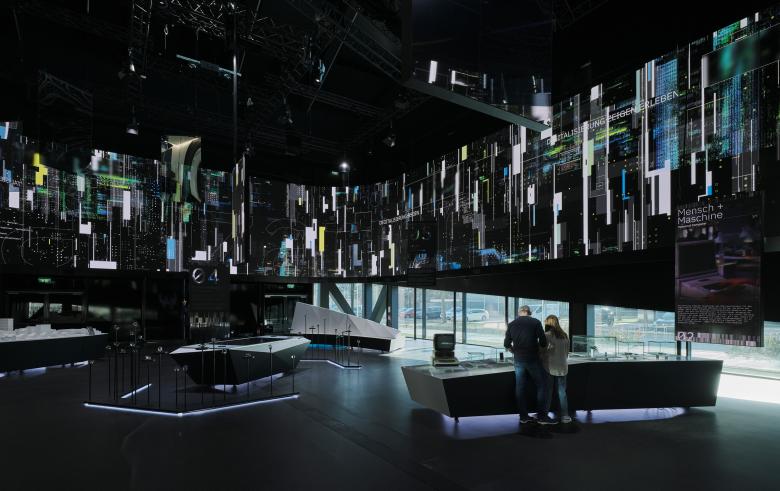 Der Showroom bildet das „Herz“ des Hauses der Digitalisierung. Hier soll die Digitalisierung erlebbar gemacht werden. Die Bedeutung des Showrooms wird architektonisch durch seine Höhe und großzügige Räumlichkeit hervorgehoben und unterstrichen. Die großzügig geschnittenen Raumproportionen in Verbindung mit den Durchblicken und Einsichten von allen Geschoßen aus offerieren ein starkes Raumerlebnis. Der Showroom ist funktional als sehr vielseitig bespielbarer Raum konzipiert, um nachhaltig zukünftige Bespielbarkeitsmöglichkeiten zu gewährleisten.