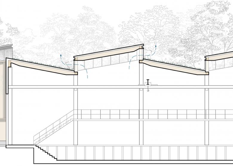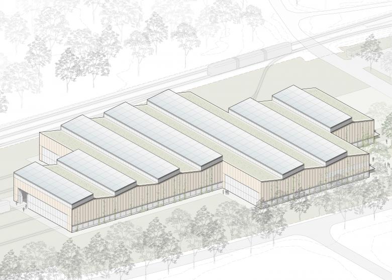 Der Baukörper ist funktional und ästhetisch durchdacht, mit einer strukturierten Vertikalisierung und differenzierten Hallenteile. Die strenge Geometrie der Oberlichtlaternen in Kombination mit der klar gegliederten Holzfassade verleiht dem großen Gebäude Maßstab, Orientierung und eine eigene Identität. Die nachhaltige Materialwahl aus Holz, Beton und Glas sorgt für eine ressourcenschonende Bauweise und eine angenehme Arbeitsatmosphäre. Eine weitere Besonderheit unseres Entwurfs ist der hohe Vorfertigungsgrad, der eine schnelle und effiziente Bauzeit ermöglichen würde.