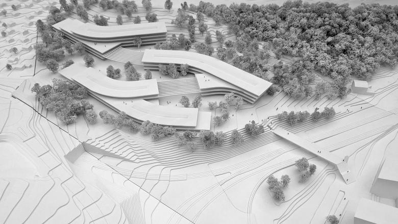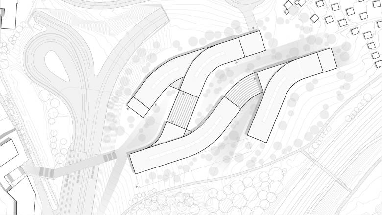 Der Universitätscampus der neuen IT:U Linz ist als architektonisch zeichenhaftes Gebäudeensemble konzipiert, das sich schlüssig in den umgebenden Kontext einfügt und diesen selbstbewusst weiterentwickelt. Die Identitätsstiftung erfolgt durch ein fließendes Gebäude mit Bezug zur Landschaft und ein vernetztes Bauwerk, das sich auf den Inhalt als „gebautes Netzwerk“ oder „gebaute Datenströme“ bezieht. Der Entwurfsansatz nimmt Bezug auf die Topografie des Grundstücks und konzipiert die Gebäude als topographische Schichten. Die spezifische, ortsprägende Charakteristik der Landschaft des beginnenden Mühlviertels wird für den Entwurf herangezogen und die Gebäudestruktur als artifizielle fließende Landschaft konzipiert: Die Baukörper bilden in ihren Hauptausrichtungen gebaute Höhenschichtlinien und fügen sich so ideal in das Grundstück ein.