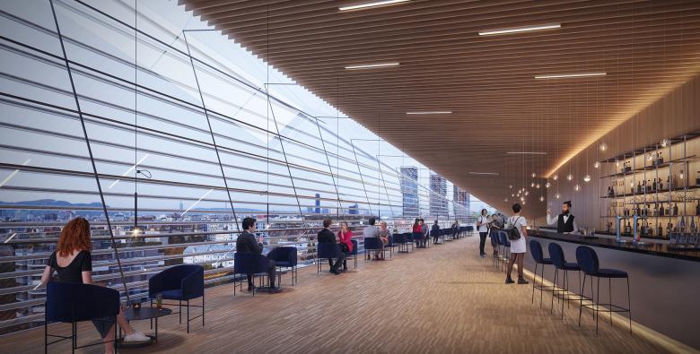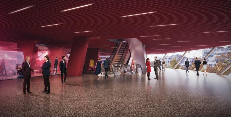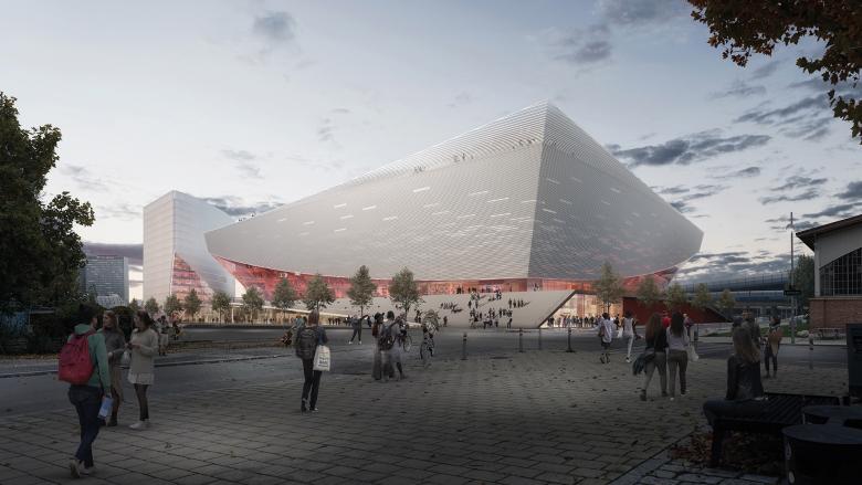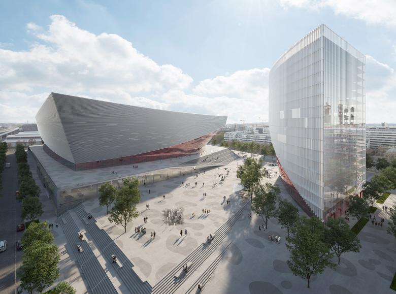 Die Einbindung der Arena an das Leben der Stadt erfolgt über ineinanderfließende Plätze, welche die Topographie des Ortes nutzen. Großzügige Verweilbereiche und Verteilebenen sind über breite Freitreppen und Rampen miteinander verschränkt. Über diesem flächigen Faltwerk der Erschließung balanciert das Volumen der Arena mit weiten Auskragungen über dem umgebenden Freiraum. Die Geometrie des Hochhauses setzt einen präzisen Kontrapunkt zur Halle. Durch den der Halle zugewandten Einschnitt wird der Dialog mit deren weiten Auskragungen aufgenommen. An diesem Punkt verdichtet sich der Platz und erhält urbanes Gepräge.
