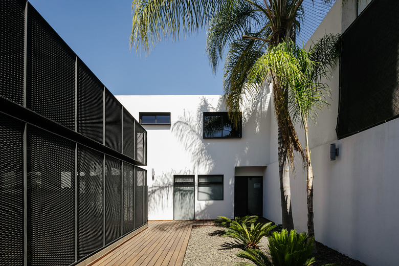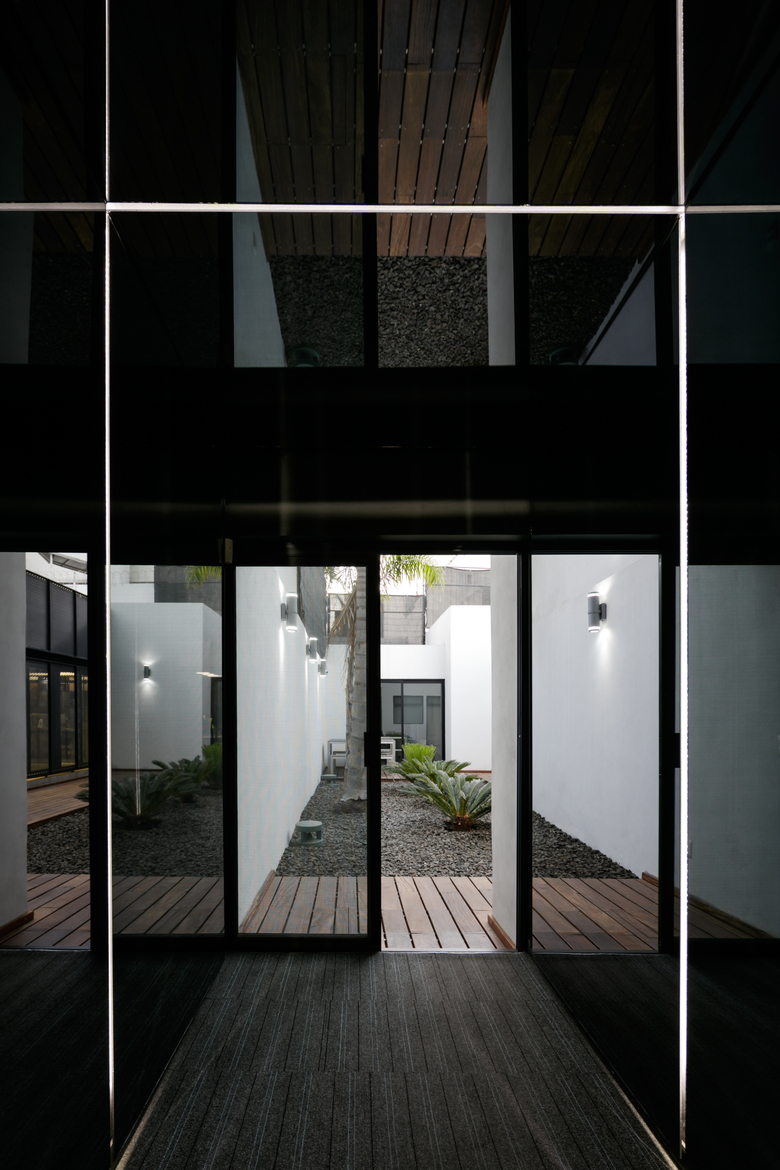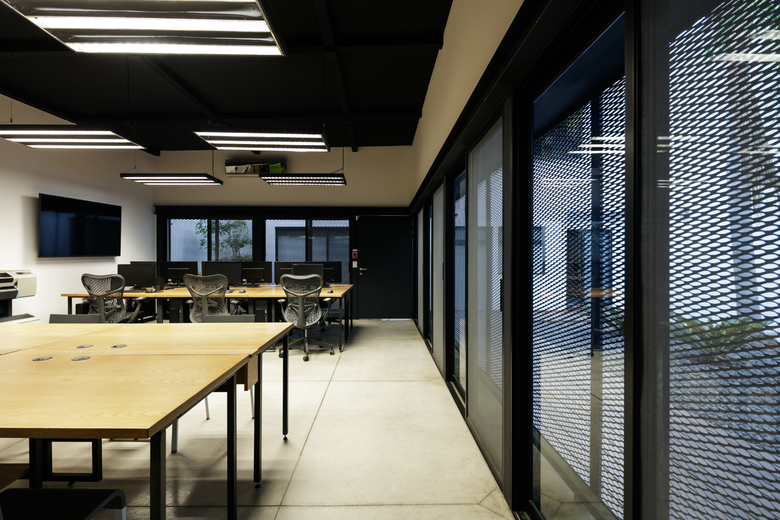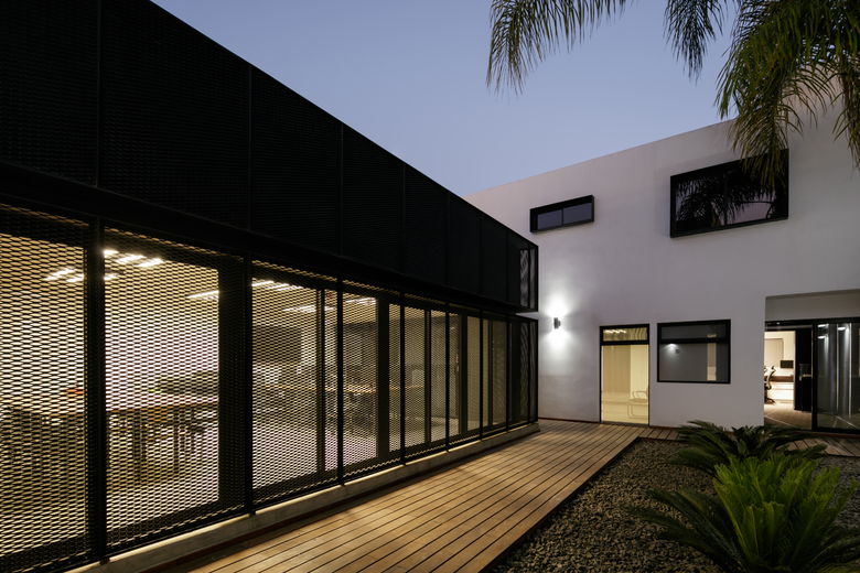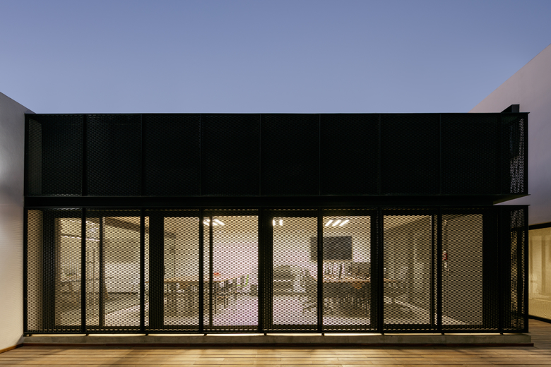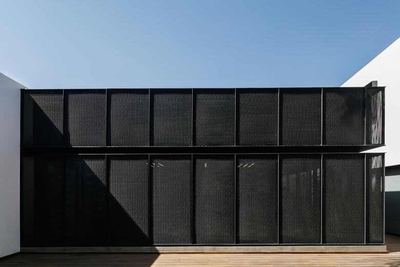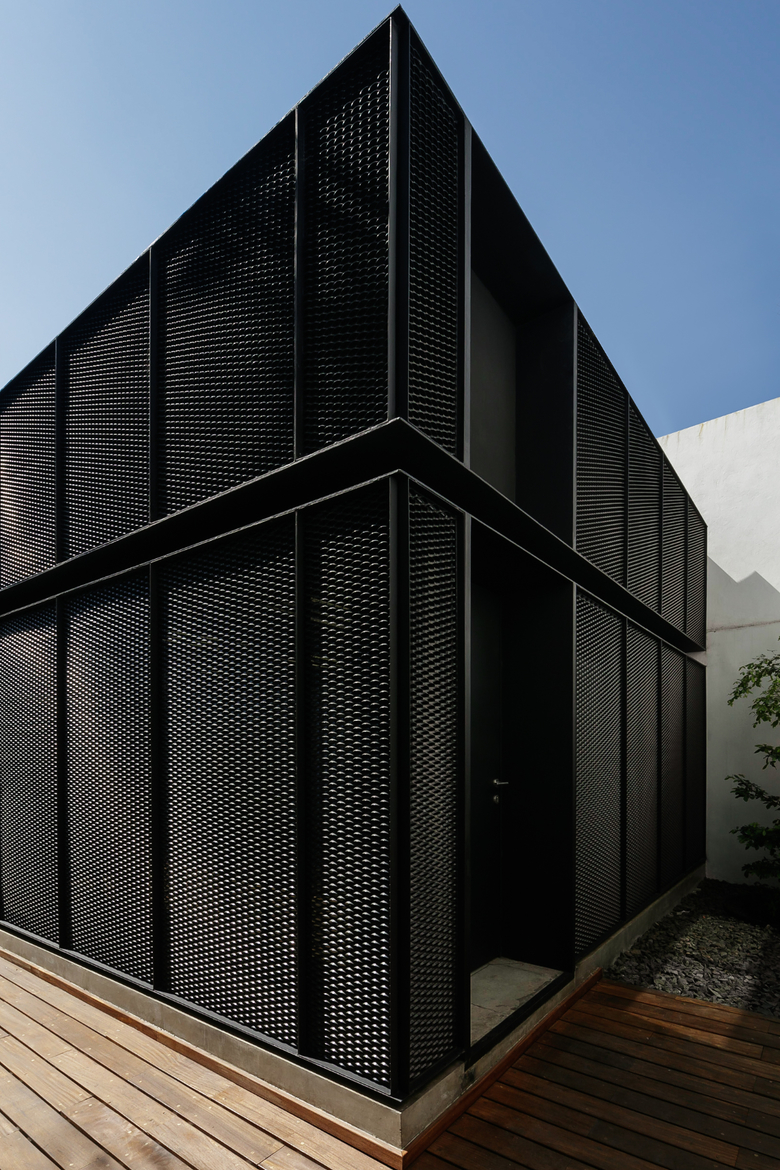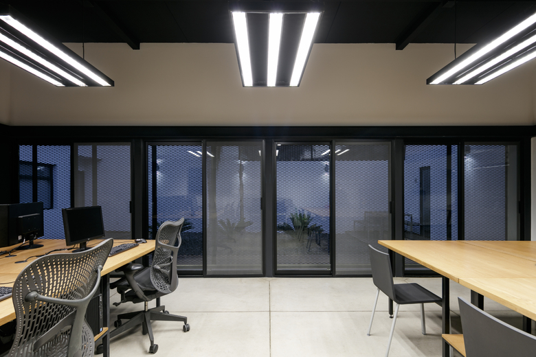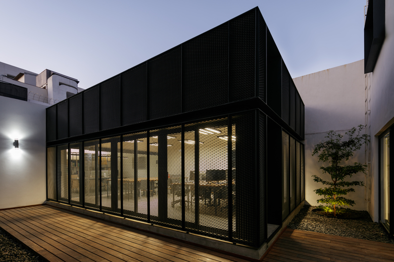 The house is clearly divided into two complementary components, the first body is for administrative and more traditional style office space, and the second component is for the creative tasks, a think box where ideas are born, discussed, distilled and condensed into realities through architectural projects. One of the challenges posed by this interpretation of the office space (as two bodies working in coordination) was how to deal with the connection between both components. The solution was to create a mirrored passage, a long walking corridor where the user sees himself reflected into a black infinity of images and could change its state of mind from the daily administrative tasks into the state of mind for a creative space, the passage is a liminal space, a rabbit hole after which another reality is waiting. Once the user has gone through the mirrored corridor it is confronted to a black box, a platonic black volume with no apparent windows or doors, the metallic screen appears to be solid hiding the working space inside. The workshop is a clear free space with natural light filtered through the metallic screen making the space friendly for computer use, two large tables partition the space into three interconnected areas where LEAP´s collaborators work, and at the rear end of the workshop a private working area is where the principals of the studio lead the team.