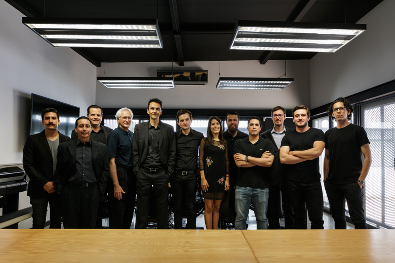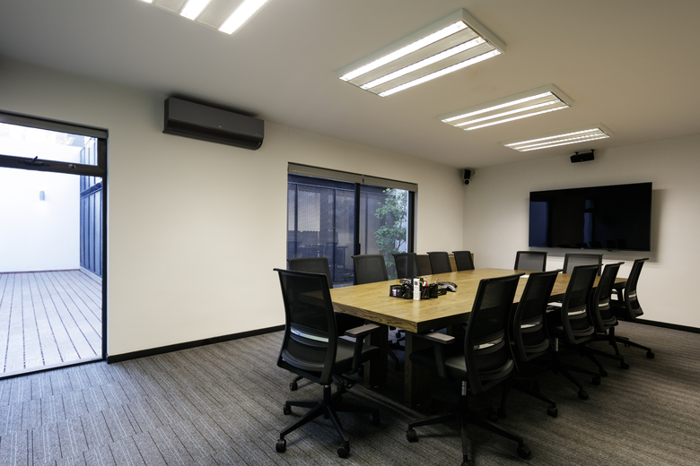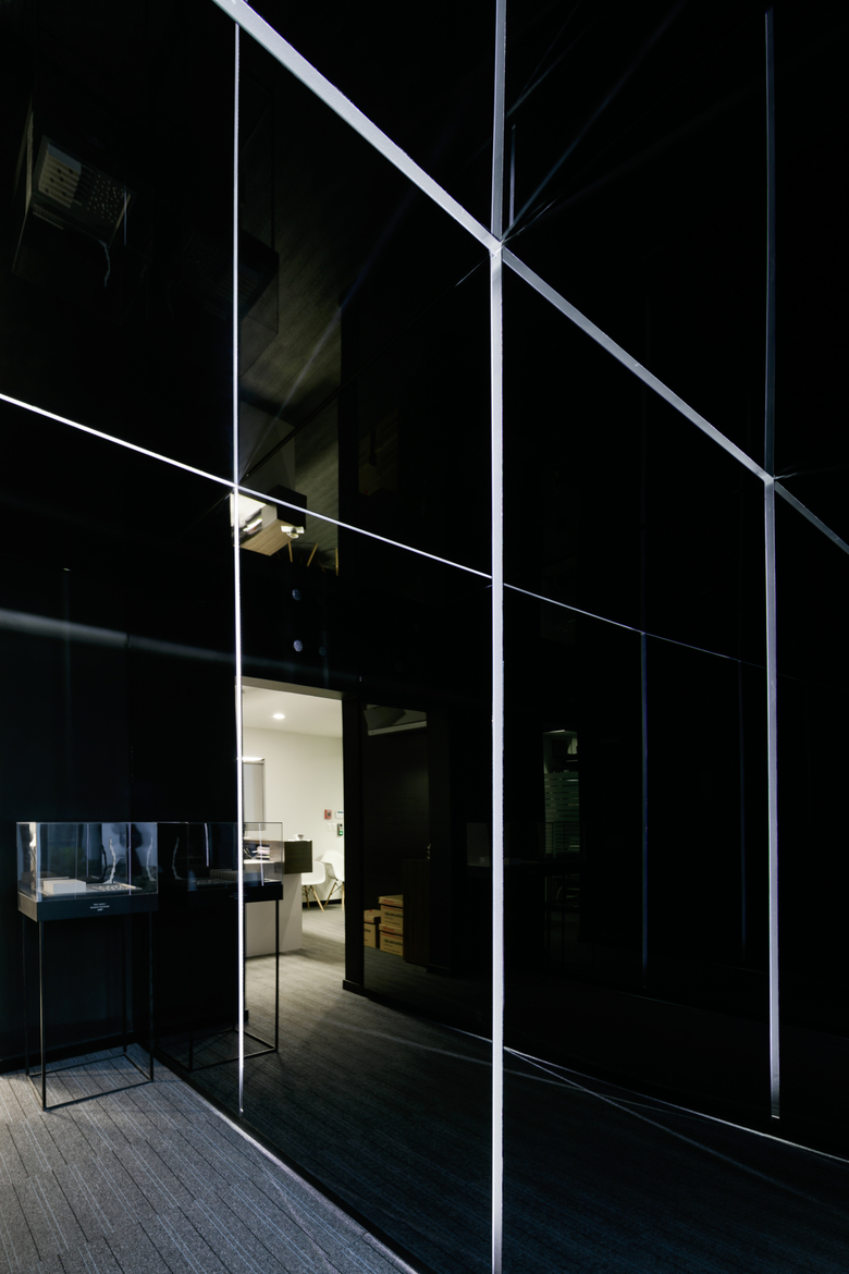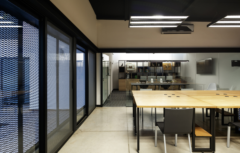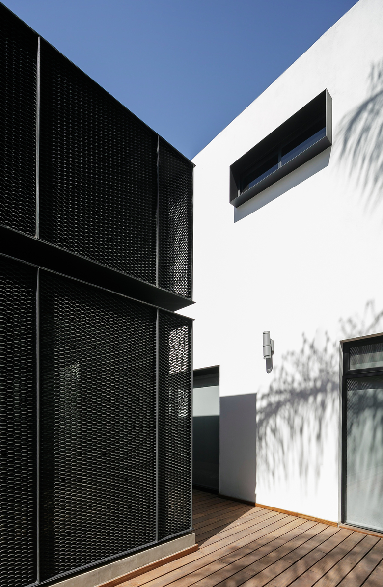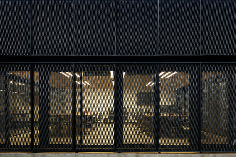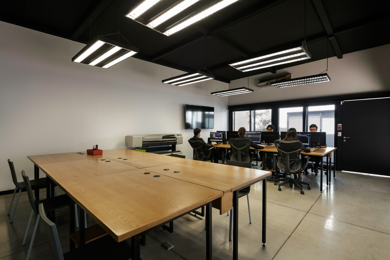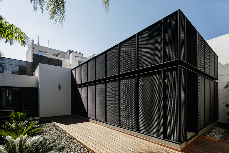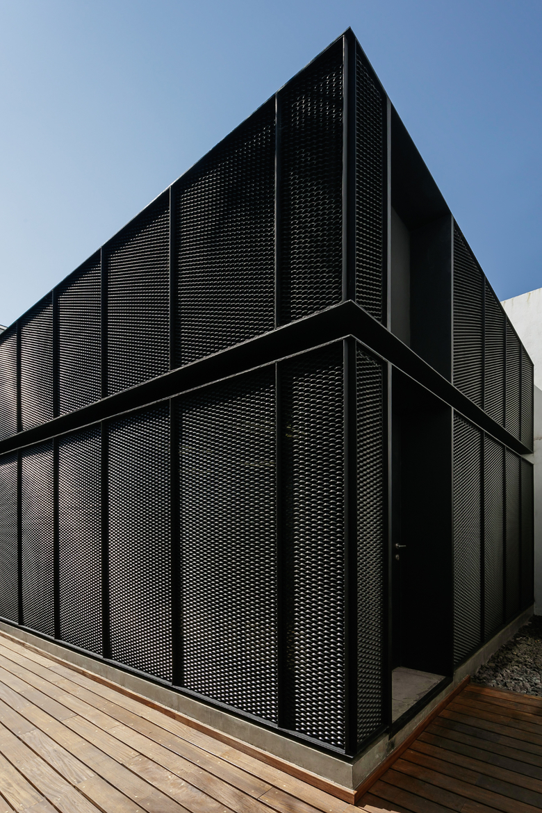 The house is clearly divided into two complementary components, the first body is for administrative and more traditional style office space, and the second component is for the creative tasks, a think box where ideas are born, discussed, distilled and condensed into realities through architectural projects. One of the challenges posed by this interpretation of the office space (as two bodies working in coordination) was how to deal with the connection between both components. The solution was to create a mirrored passage, a long walking corridor where the user sees himself reflected into a black infinity of images and could change its state of mind from the daily administrative tasks into the state of mind for a creative space, the passage is a liminal space, a rabbit hole after which another reality is waiting. Once the user has gone through the mirrored corridor it is confronted to a black box, a platonic black volume with no apparent windows or doors, the metallic screen appears to be solid hiding the working space inside. The workshop is a clear free space with natural light filtered through the metallic screen making the space friendly for computer use, two large tables partition the space into three interconnected areas where LEAP´s collaborators work, and at the rear end of the workshop a private working area is where the principals of the studio lead the team.