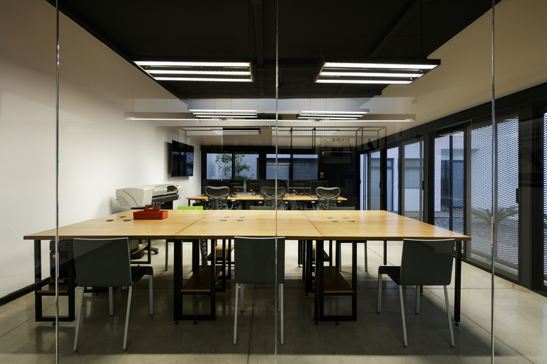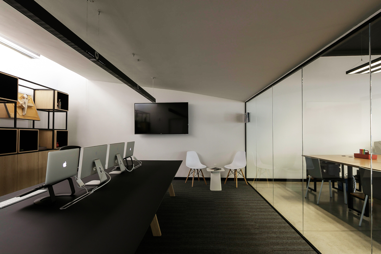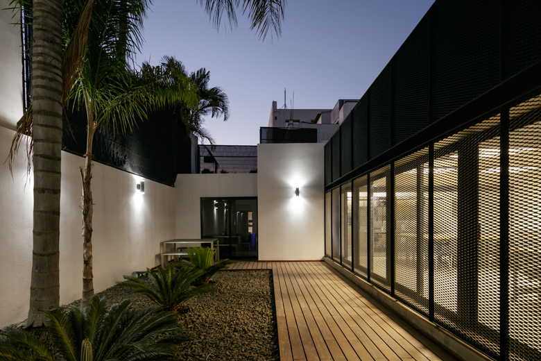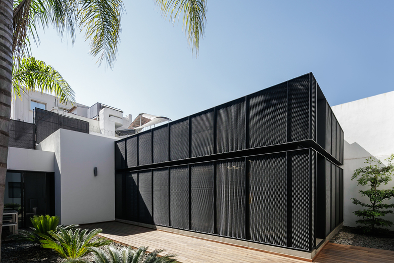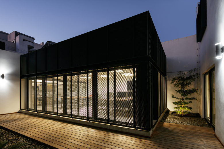 LEAP Laboratorio en Arquitectura Progresiva is an architectural firm working from Guadalajara, Mexico since the year 2001 and has a new office space. The house where their creative space was built is a 40 years old house that is a couple of lots to the north of the headquarters of MTQ, a leader company in the A/E/C sector, specialized on the technical and engineering aspects of architectural projects and a strategic partner of LEAP since its beginnings. When the property came into the real estate market it was a natural choice to acquire it because the location just some meters away from MTQ. The house had always been used as a private residence, and has a medium sized backyard and a terrace. The project recycled the bedrooms in the upper level as private office spaces, the former space for dining on the first floor was transformed into the new meeting room, minor transformations were made to convert the kitchen into the office reception, and in the backyard a new black metallic box was built, this box is the workshop space where the architectural projects are carried out. At the end of the workshop space, a transparent division gives privacy to the principals of the studio.