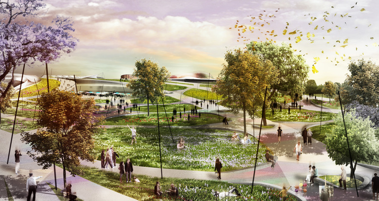 La vinculación entre la explanada interior de acceso y el ingreso a los edificios, se lleva a cabo a través de una red de senderos que corren por el parque entre áreas verdes y pequeñas plazas arboladas que permiten un tránsito fluido y desembocan en las plazoletas de ingreso de la Arena de espectáculos y el Foro.