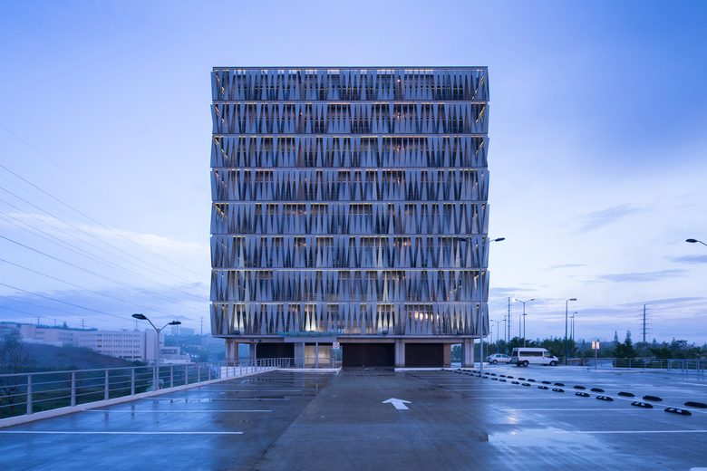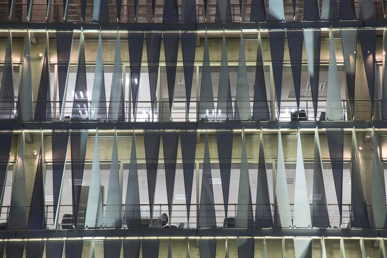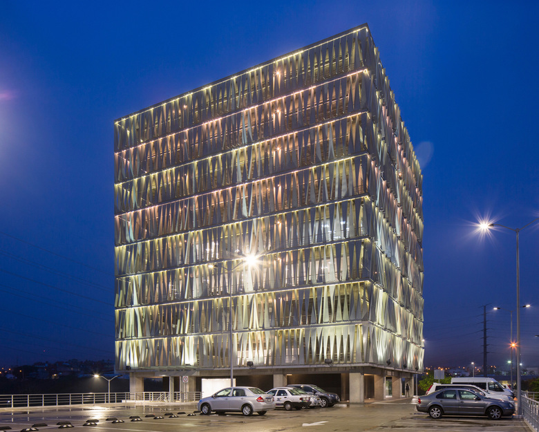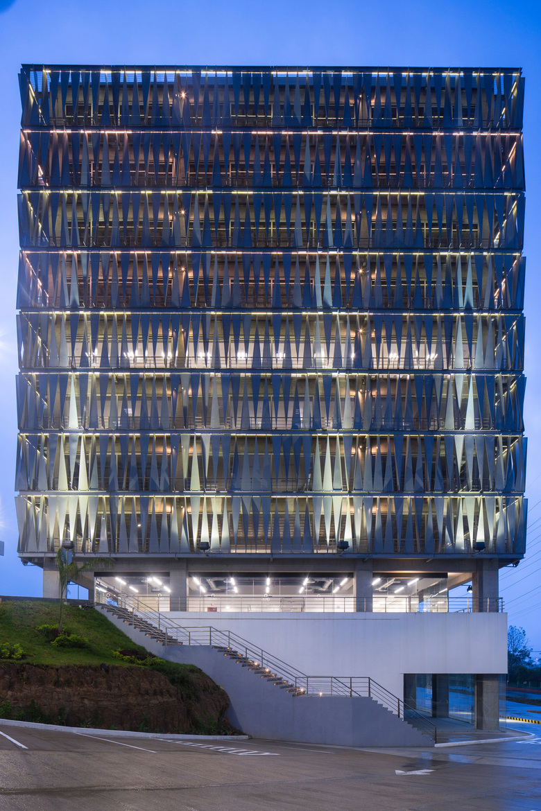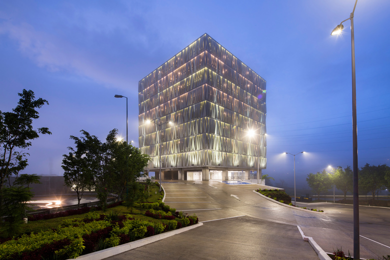 El diseño de la piel metálica del cubo de oficinas le imprime al conjunto un carácter muy peculiar. Desde cierta distancia y a la luz del día se percibe como un cubo metálico con una marcada textura angulosa de sólidos y vacíos triangulares. Esta textura sin patrón definido se logra con tan solo dos triángulos rectángulos que conforman un panel tridimensional. Los diferentes acomodos de los triángulos, así como la colocación azarosa de los paneles sobre la estructura, nos permiten lograr una rica textura metálica de percepción casi caótica. De noche, esta piel de acero pierde la solidez, debido a que la luz interior se escapa por las diminutas perforaciones de la lámina, ofreciendo un juego de luces y sombras muy interesante que, al igual que de día, aporta positivamente al paisaje urbano de la ciudad.