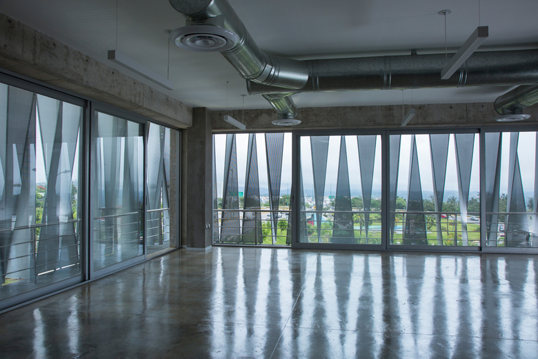 El cubo de oficinas está recubierto por una piel de lámina metálica multiperforada, electro pintada marca LADESA, que funciona como una pantalla con transparencia que nos permite controlar la incidencia solar y bajar la ganancia térmica de las oficinas, lo cual beneficia en un menor consumo energético, así como en un mayor confort en los niveles de iluminación natural hacia el interior. Entre la piel de metal y los ventanales del edificio existe un pasillo perimetral de rejilla Irving, el cual es accesible a los usuarios de las oficinas a manera de balcón.