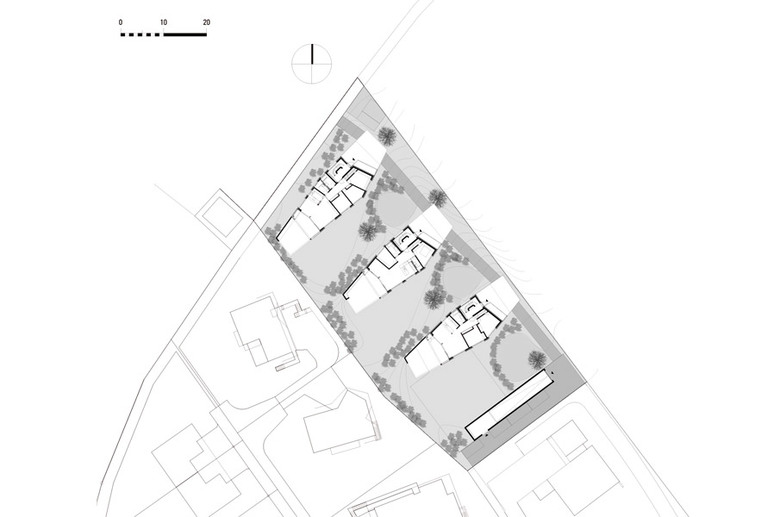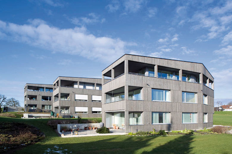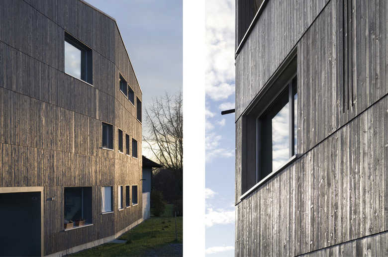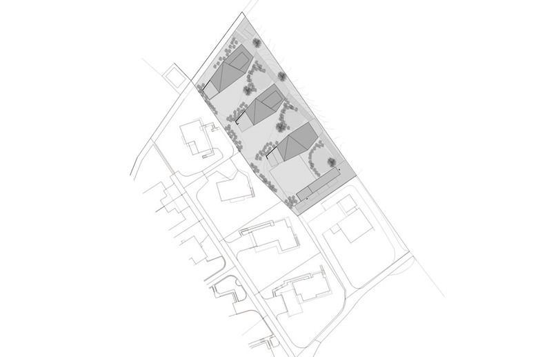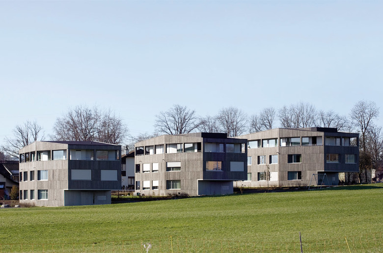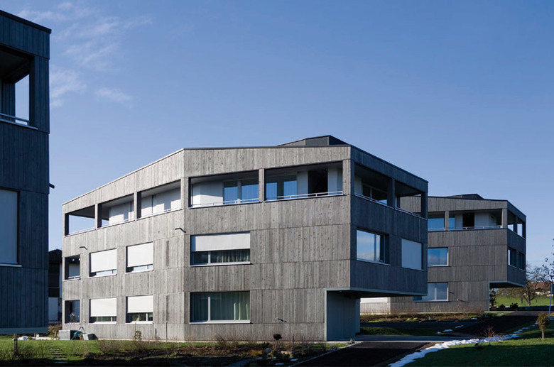Die drei Wohnhäuser stehen im Übergang von der Bauzone zur Landwirtschaftszone. Stellung und Form der Gebäude, die sich gegen die Schmalseiten verjüngen, bewirken, dass die Überbauung Teil der bäuerlichen Kulturlandschaft geworden ist. Wie vorübergehend deponierte Heuwagen stehen die Häuser am Rande der Wiesen und Äcker. Die räumliche Weite der Landschaft fliesst durch die mäandrierenden Zwischenräume und wird mit einer wilden Hecke gegen das angrenzende Einfamilienhausquartier abgeschlossen. Das Knicken der Längsfassaden ermöglicht die Aussicht vorbei am vorderen Haus in die Voralpen. Die Holzverkleidung lässt eine hohe Integration der Volumen in ihre Umgebung zu. Farbe und Verarbeitung der lasierten vertikalen Holzschalung mit Brettchen von unterschiedlichen Breiten, erinnern an die silberne Patina verwitterter Scheunen. Das Beimischen von Metallpigmenten in die Lasur verleiht der Oberfläche zusätzlich Tiefe. Mit einer zurückhaltenden Farbigkeit werden die in die Volumen eingeschnittenen gedeckten Eingangsbereiche ausgezeichnet. Als fünfte Fassade sind die leicht geneigten Schrägdächer mit beschiefertem Bitumen eingedeckt. Diese überdecken die Attikageschosse vollständig und ermöglichen einfache kompakte Baukörper. Wohnungsinterne Treppen von den Erdgeschossen und Attikageschossen zu den 1. Obergeschossen sowie das leicht grössere dritte Haus ergeben innerhalb der gleichen Strukturen unterschiedliche Wohnungsgrössen von 3 ½ bis 5 ½ Zimmern. Die Tragstruktur ist in Massivbauweise erstellt. Die Dächer mit den eingeschobenen Dachterrassen sowie die Attika-, Loggia- und Eingangsbereiche sind in Holz konstruiert und verkleidet. Der Minergie-Standard wurde mit einer hochwärmegedämmten Gebäudehülle, dreifach verglasten Holzfenstern und der kontrollierten Wohnungslüftung erreicht. Eine Wärmepumpe mit Erdsonden erzeugt die Heizwärme und das Warmwasser.