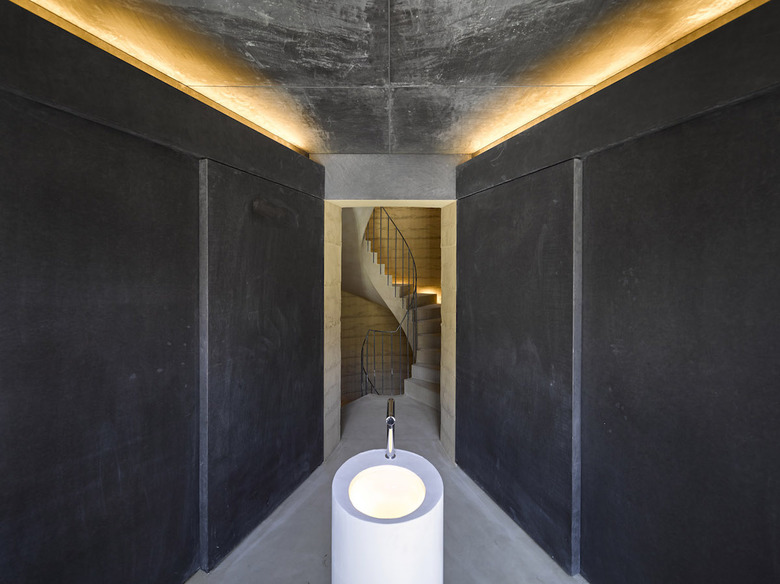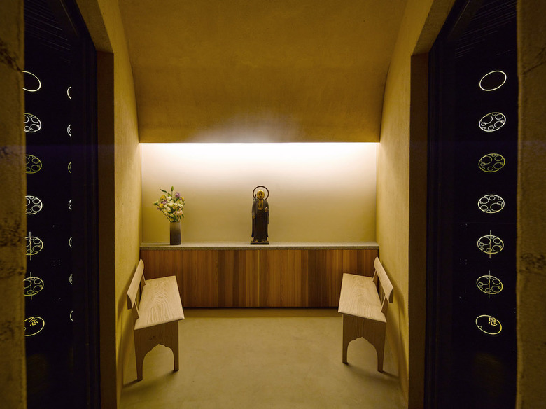 こうして「死」の象徴である納骨堂や墓に対して、そこにに至るまでの参道を「生」の象徴として対置させた。水盤を跨ぐように掛けられた階段は生死を分ける結界として機能する。八角形の納骨堂は宇宙のかたち=冥土そのもので、薄暗いエントランスはその輝度差ゆえ場の変換を意識させ、中心部にある版築の螺旋階段は天空のトップライトが土中を意識させつつ、回転運動の中で内省を促す。辿り着いた納骨室は光る扉が惑星のようで、竹天井隙間からの光が星のように瞬き、宇宙空間を連想させる。ここで故人と対面する。一連の建築的設えは参拝行為の時系列に沿って直接知覚に訴えるように出来ている。