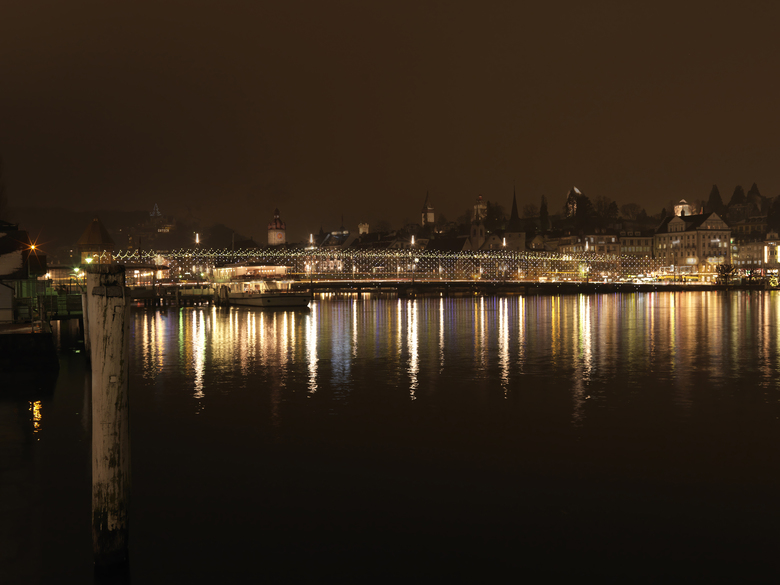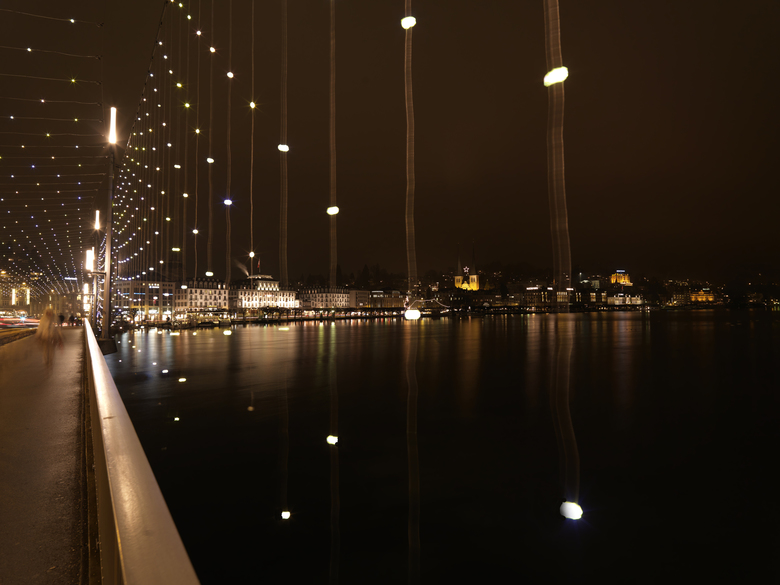 Eine Weihnachtliche Stimmung zu verbreiten ist das Hauptanliegen der neuen Weihnachtsbeleuchtung über der Seebrücke in Luzern. Unser Vorschlag ist nicht in erster Linie eine Inszenierung von einer Form oder einer Raumidee, sondern soll eine Stimmung verbreiten, ein sinnliches Ereignis darstellen und Atmosphäre schaffen. Die freistehende Brücke bildet dazu eine ideale Bühne. Der Lichtervorhang, welcher über die Brücke gespannt wird, soll einem Tuch ähnlich den Passanten einhüllen. Es wird so gewollt ein Lichterbaldachin erzeugt, welches den sonst eher ungemütlichen, kalten Übergang zum See zu einem optisch warmen Erlebnis macht.