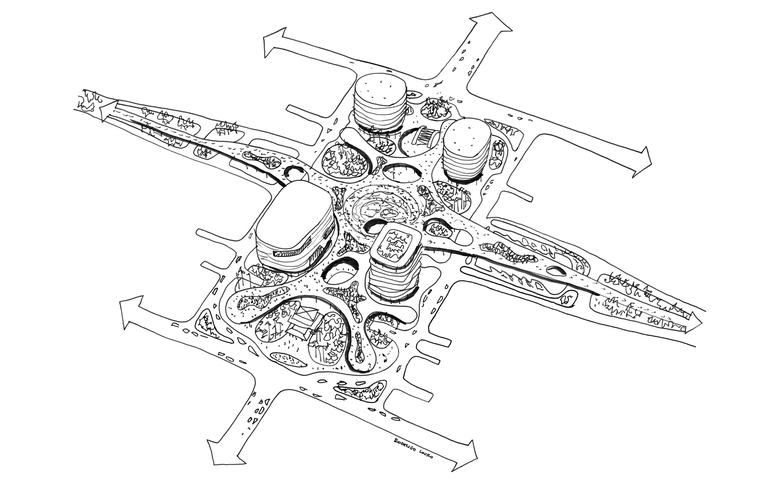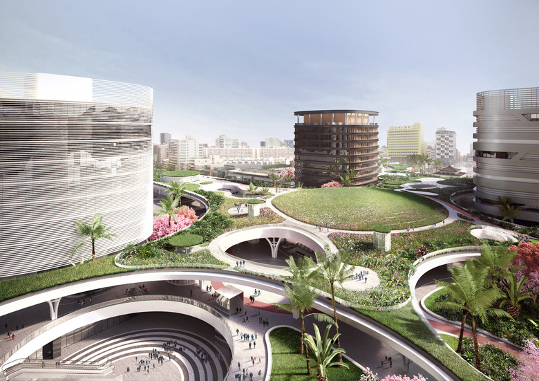 - Site of 8.5 ha with sunken station plaza (13,000 m2), green canopy (35,000 m2), multilayer bicycle path, landscape (60,000 m2), hotel (22,000 m2), commercial building (52,000 m2), local and intercity bus terminal, restoration of colonial Japanese