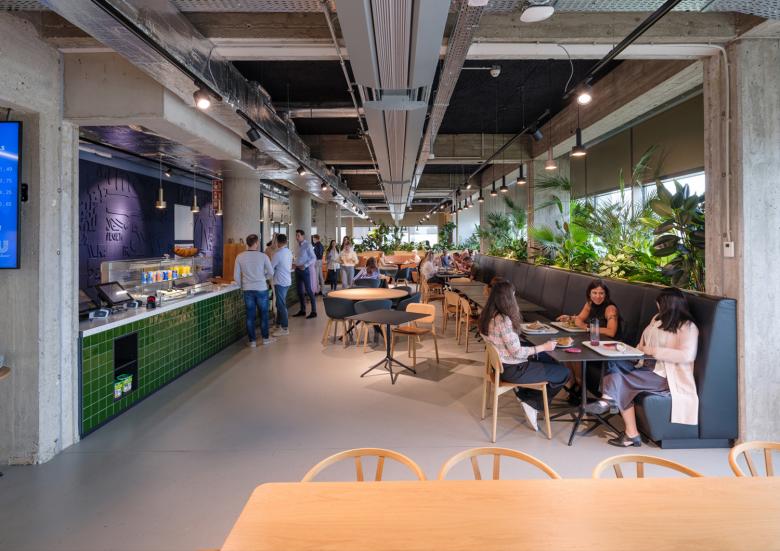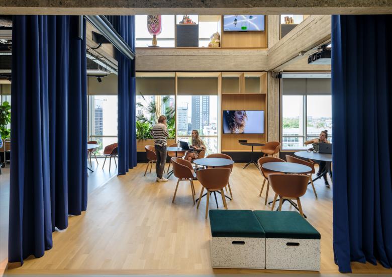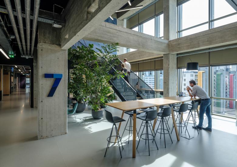 In the heart of Rotterdam on Hofplein, the new Unilever Benelux headquarters is being realised. The headquarters occupy six floors of an existing building from 1960 by architect C.A. Abspoel and have a striking concrete structure. The new Unilever facility will accommodate around 750 employees. Upon entering the sixth floor, visitors are welcomed in the Lipton Bar exhibiting a beautiful view of the city. From the Lipton Bar, all floors are accessible via internal stairs.