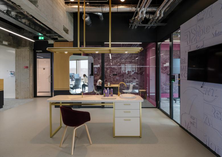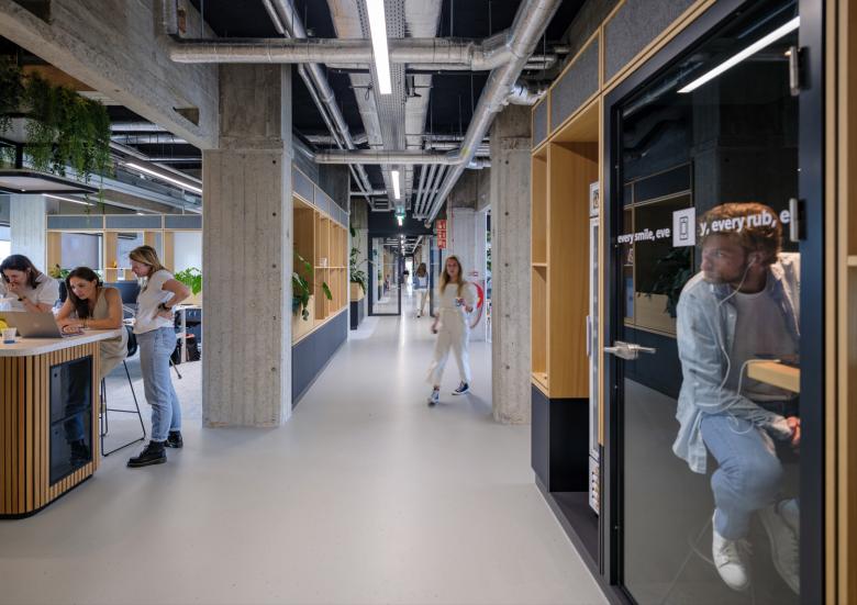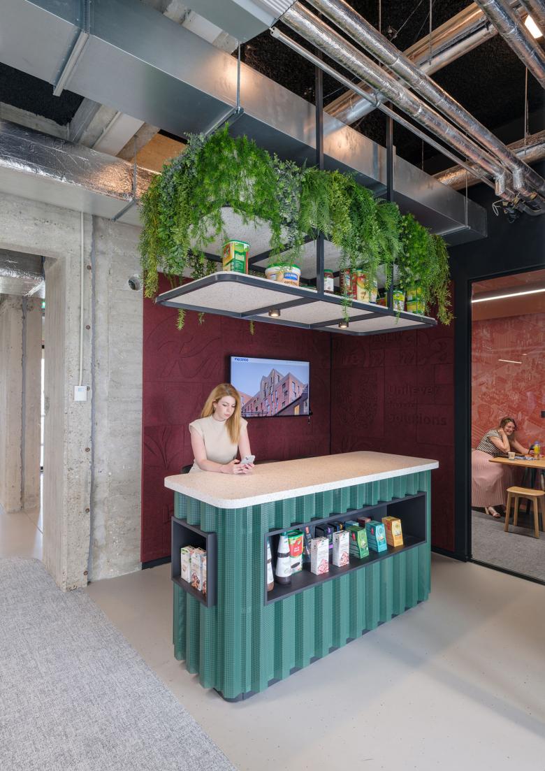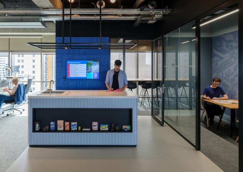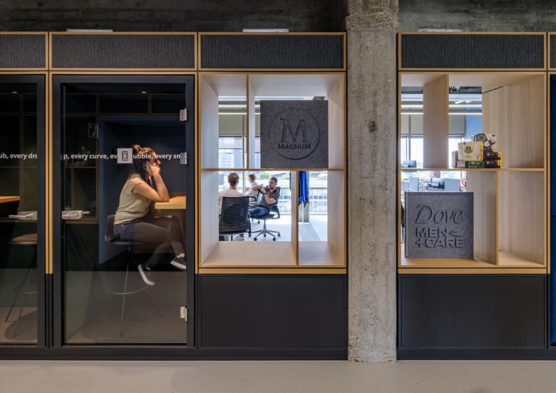 The interior is designed as a city with streets and shops: Unilever City. Multipurpose cabinets placed between the concrete structure form a street in the middle of the building. Workplaces of the various Unilever departments are located on the street, each with their own identity, brands and character traits. They form the shops on the street. Brand hubs of Beauty & Personal Care, Home Care, Refreshment, Foods and Food Solutions departments emphasise the atmosphere of these departments, each having their own identity and forming a hotspot where products can be presented and tested.