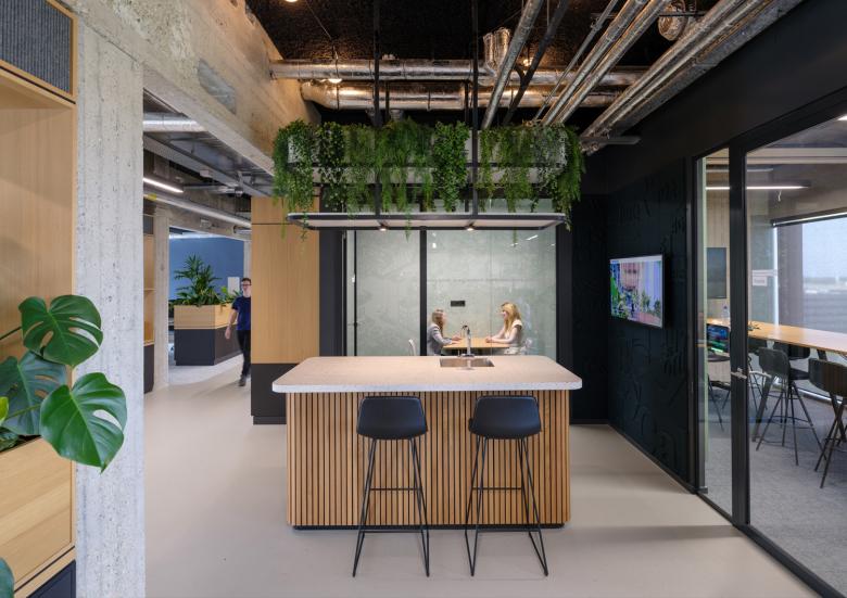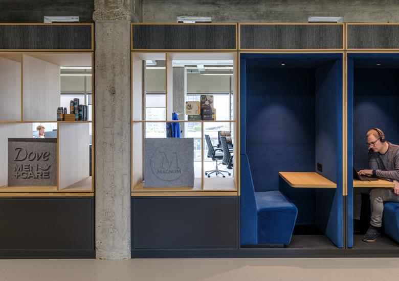 The mix of working, meeting, calling, consultation, presentation and other use and accommodation areas creates a dynamic environment to work in an activity-based manner. Unilever employees can find a place that suits their activity of the time. This stimulates collaborations, knowledge exchange, meetings and because you move more through the building, it also promotes health. The materials used strengthen the industrial character of the building. The black steel, oak, the cast floor and tiles form a neutral basis, giving the space to showcase Unilever’s products and marketing.