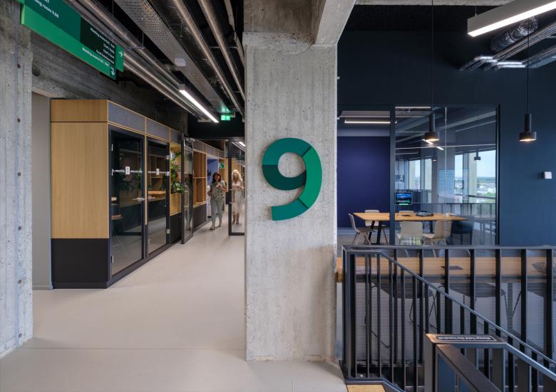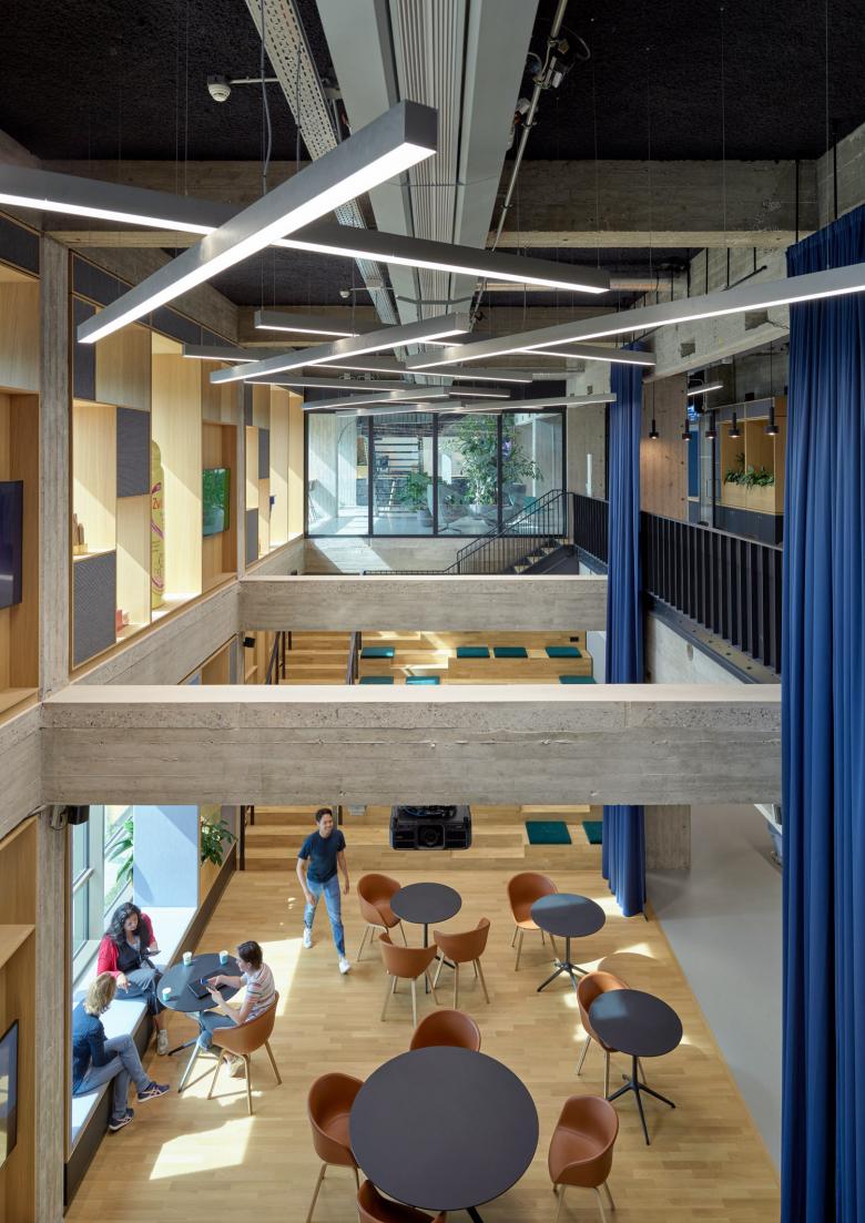 Breakthroughs were made in the floors creating voids that connect the various departments and thus employees. Upon entering, the auditorium, the so called townhall, immediately stands out. This auditorium as well as the event space and restaurant are multifunctional and can be used for events, lectures and a place to have lunch. They can also be used for informal meetings or working, making these functions all part of the working environment.