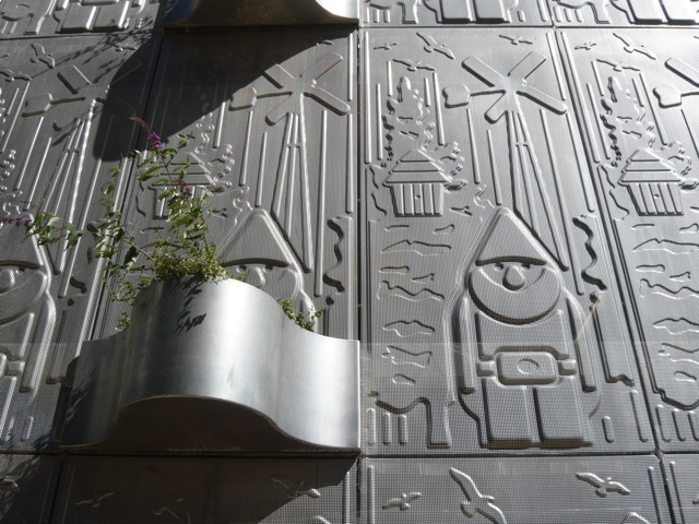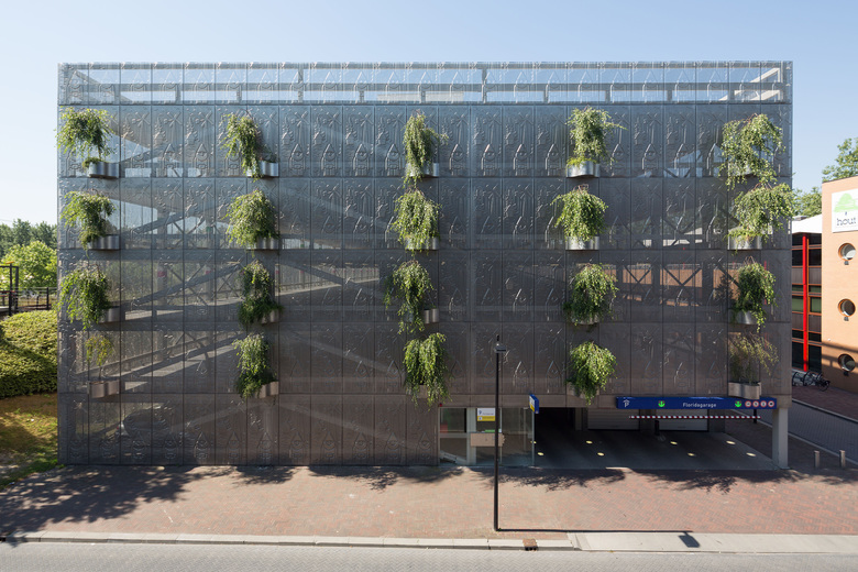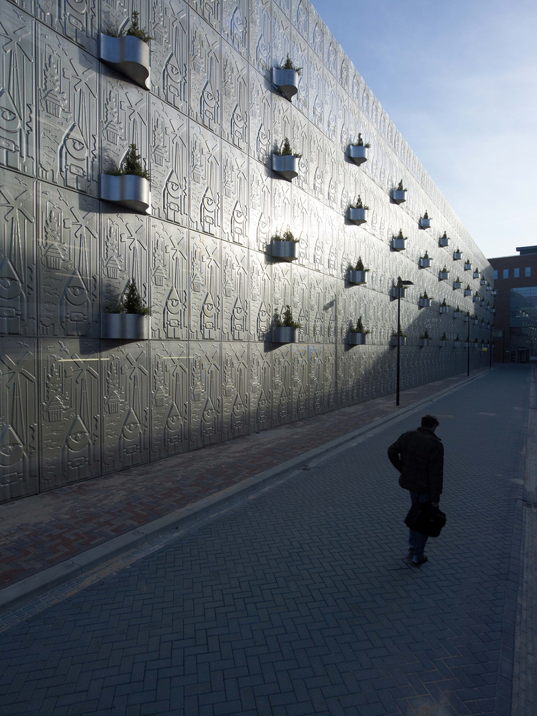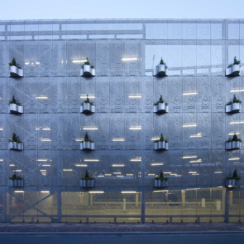 The special facade of the garage contains natural elements, like integrated plant containers with specific plants based on the orientation of the facade. By using a vacuum forming technique, commonly utilized in the automotive industry, the perforated facade panels show characteristic images of the province of Flevoland like birds, windmills, garden gnomes and bird houses. The surface relief created by the pressed figures on the panels lends the garage the appearance of a cheerful-looking giant tin can. Since the facade panels act as veils, the garage interior is flooded with daylight. This also creates a sense of community safety and pleasant natural ventilation in the garage. In the evening hours the facade acts as a luminous object that further enhances community safety in the immediate surroundings.