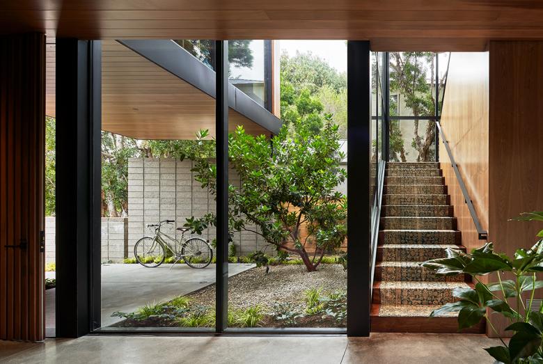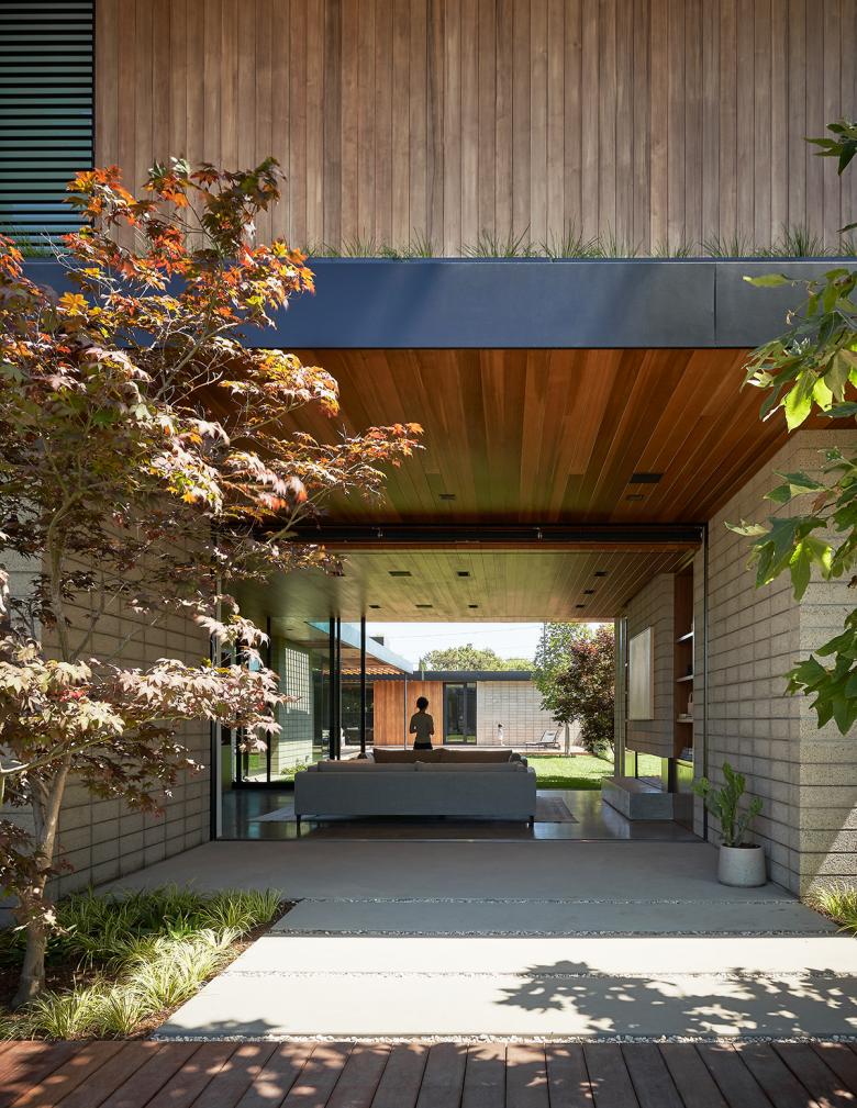 The airy Venice Beach home was designed with the intent of blurring the lines between indoor and outdoor spaces to achieve a warm, tranquil home. The design began with its exterior, to ensure the family could enjoy the perks of Southern California’s year-round mild climate. The general sense of warmth throughout the home is driven by the use of natural materials like wood. By contrast, the concrete block walls give the home an almost midcentury sensibility while clearly creating a dialogue with the wood and other earth tones. Woven into the home’s design are three ‘gardens,’ all varying in scale and function. The larger garden creates drama, while two smaller gardens allow for intimacy and moments of pause. A series of parallel datum walls constructed of concrete blocks anchor the gardens and organize the interior spaces around the exterior space.