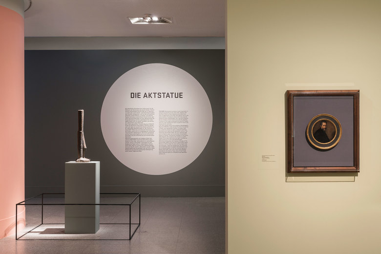 Die Ausstellungstexte werden im Kontrast zu den farbigen Wänden durch helle, kreisförmige Elemente hervorgehoben. Diese abstrakten Textspotlights lenken den Blick inmitten der sehr heterogenen Ausstellungsexponate immer wieder auf die Hintergründe und Zusammenhänge der Kunstwerke.