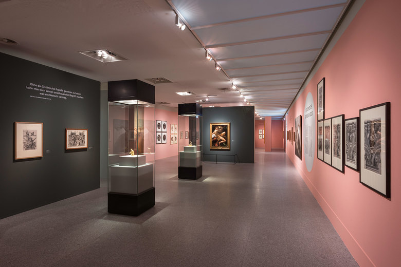 Das Farbkonzept der Ausstellung besteht aus sich stufenweise entwickelnden und rhythmisch wiederkehrenden Rosa-, Beige, und Grau-Tönen. Innerhalb des Ausstellungsrundgangs ergeben sich immer wieder Durchblicke zu den einzelnen Ausstellungsbereichen, welche die Wechselbeziehungen der Farbtöne als Farbschichten sichtbar machen. Das Farbkonzept untermalt die kuratorische Idee der Verflechtung der einzelnen Werke miteinander und zu Michelangelo. Ein intensives Magenta und ein leuchtendes Gelb setzen zudem Akzente in den Türdurchgängen.
