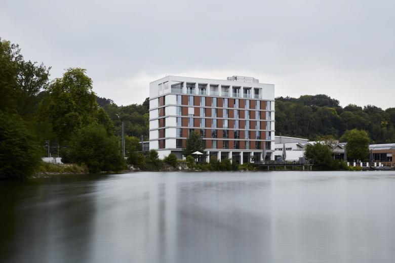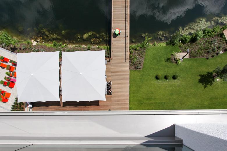 Die bodentiefe Verglasung der Fronten lassen den Blick frei auf den Ausee schweifen. Urlaubsgefühle. Am besten man folgt diesen hinaus auf eine der drei großen Seeterrassen und lässt sich dort treiben. Zwischen See und Grün, denn die parkähnliche Gartenanlage rund um das Hotel geht nahtlos in die öffentlichen Grünanlagen der Friedrichsau über.