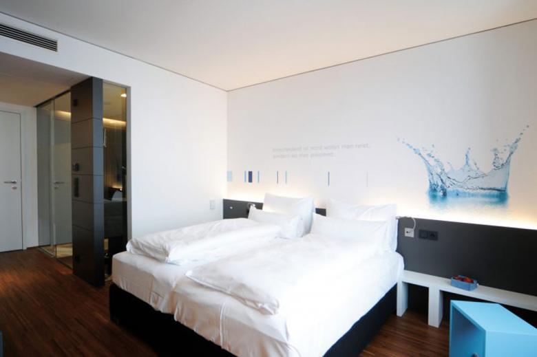 Die Auswahl von Mobiliar, Farben und Accessoires erfolgte nicht nur unter dem Aspekt der Langlebigkeit, sondern auch mit Fokus auf gesundes Wohnen mit schadstoffarmen Materialien. Darüber hinaus erzeugen gegensätzliche Materialien wie weiches Holz kombiniert mit Stein optische Lebendigkeit. Die Leitfarben Orange, Hellblau, Hellgrün und Rot, die die einzelnen Etagen individualisieren, stellen eine Hommage an die Hochschule für Gestaltung Ulm dar, deren Designobjekte ebenfalls in die Ausstattung des Hotels integriert und somit erlebbar gemacht wurden.