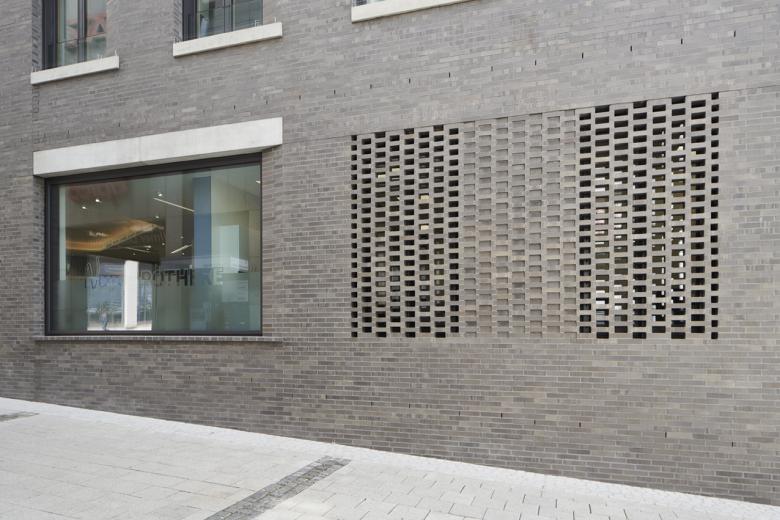 Gesamtheitlich betrachtet zeigt die Lochfassade eine klare Struktur, deren Öffnungsanteil so gewählt ist, dass das Gebäude in seinem Erscheinungsbild als homogener Körper wahrgenommen wird, der fest in der Bahnhofstraße verankert ist.