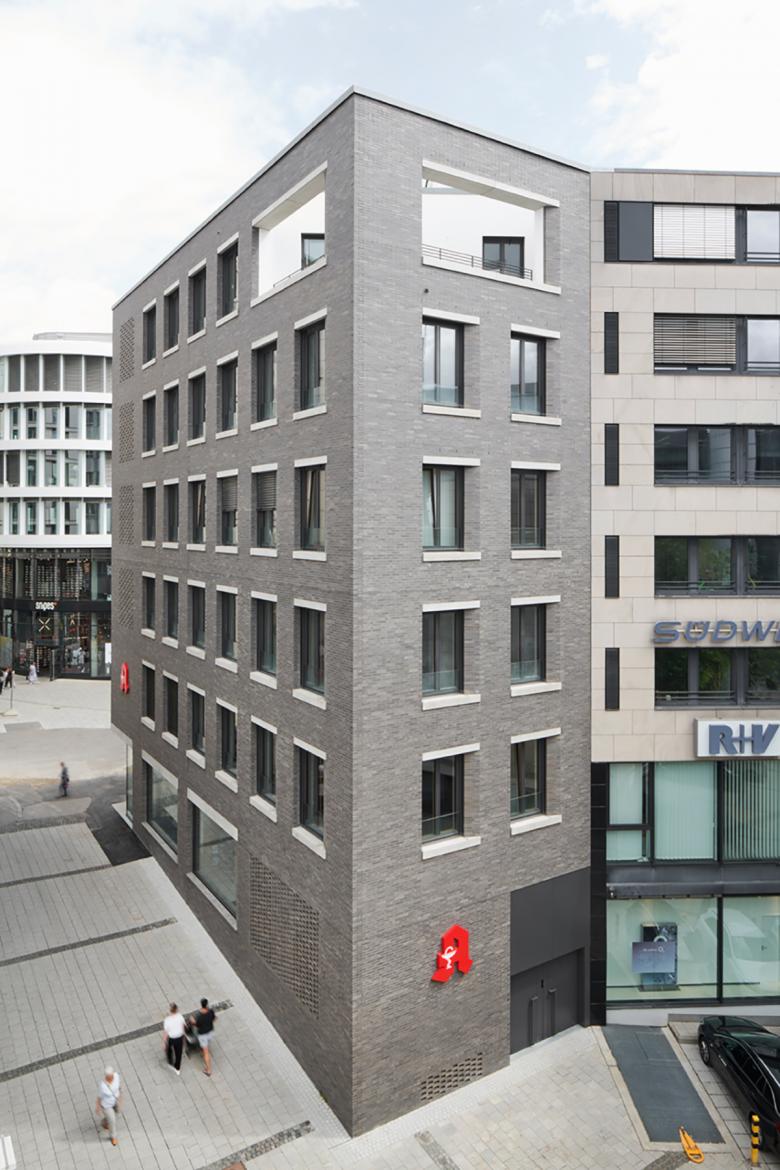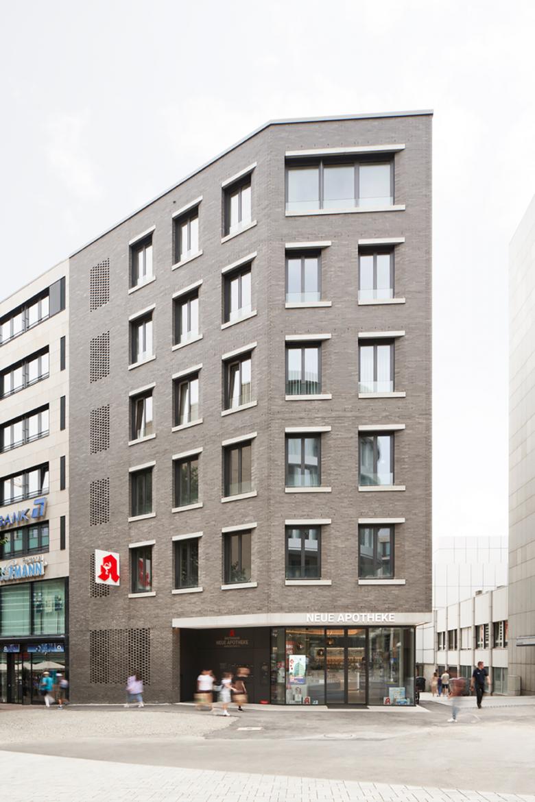 Die Fassade gliedert sich in drei Bereiche: Sockel-, Regel- und Wohngeschoss. Im Erdgeschoss ist die geschosshoch verglaste Fassade teilweise zurückversetzt, um die Eingänge und Schaufenster ohne Vordachkonstruktionen zu schützen. Aus Diskretionsgründen sind die Fensteröffnungen im rückwärtigen Bereich der Apotheke optisch geschlossen. Hier dringt durch regelmäßig ausgesparte Ziegelsteine Tageslicht in die Räumlichkeiten.