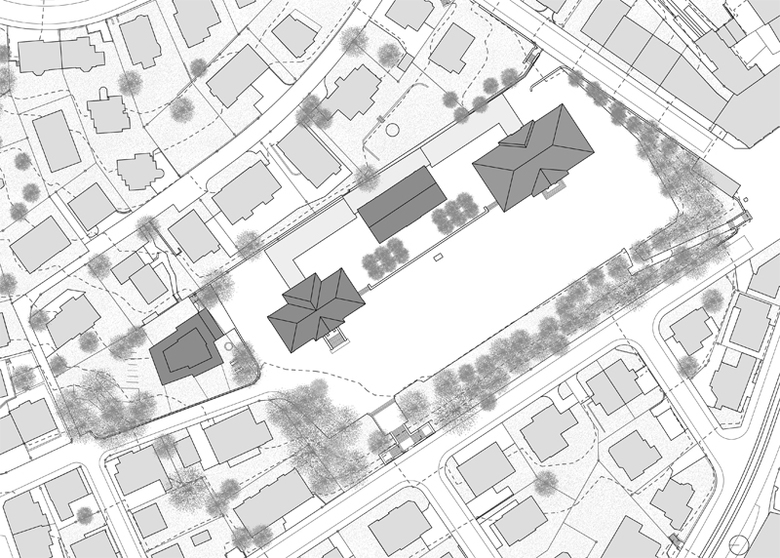 An dieser Stelle knüpft der Entwurf für den Ersatzneubau an. Das neue Gebäude grenzt im Norden unmittelbar an das Schulhaus-Plateau an und reiht sich als weiterer Solitär selbstverständlich in das bestehende, kompositorisch linear ausgerichtete Ensemble der Schulanlage ein. Zusammen mit den nördlich gelegenen Wohnhäusern wird die Begrenzung des Plateaus durch die Setzung des Hortgebäudes an dieser Stelle verstärkt. Gleichzeitig bleibt der eigenständige, quartiertypische Grünraum mit wertvollem Baumbestand, welcher durch den „kleinen“ Gebäudeabdruck nur geringfügig tangiert wird, bestehen.