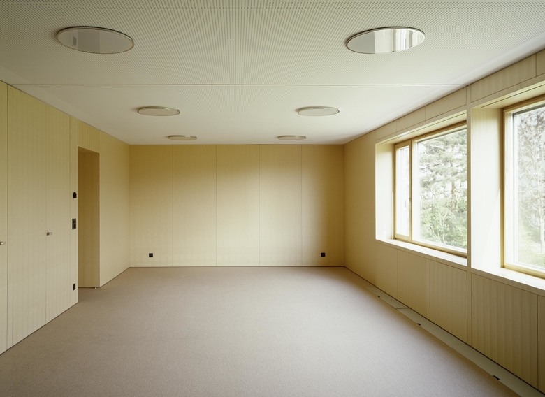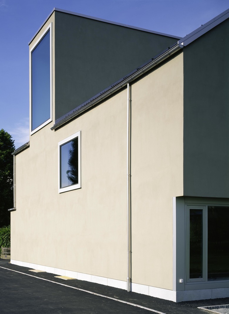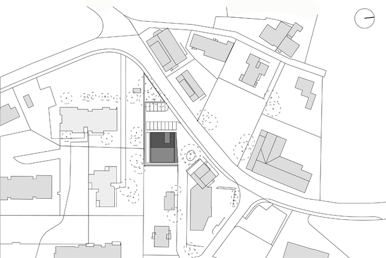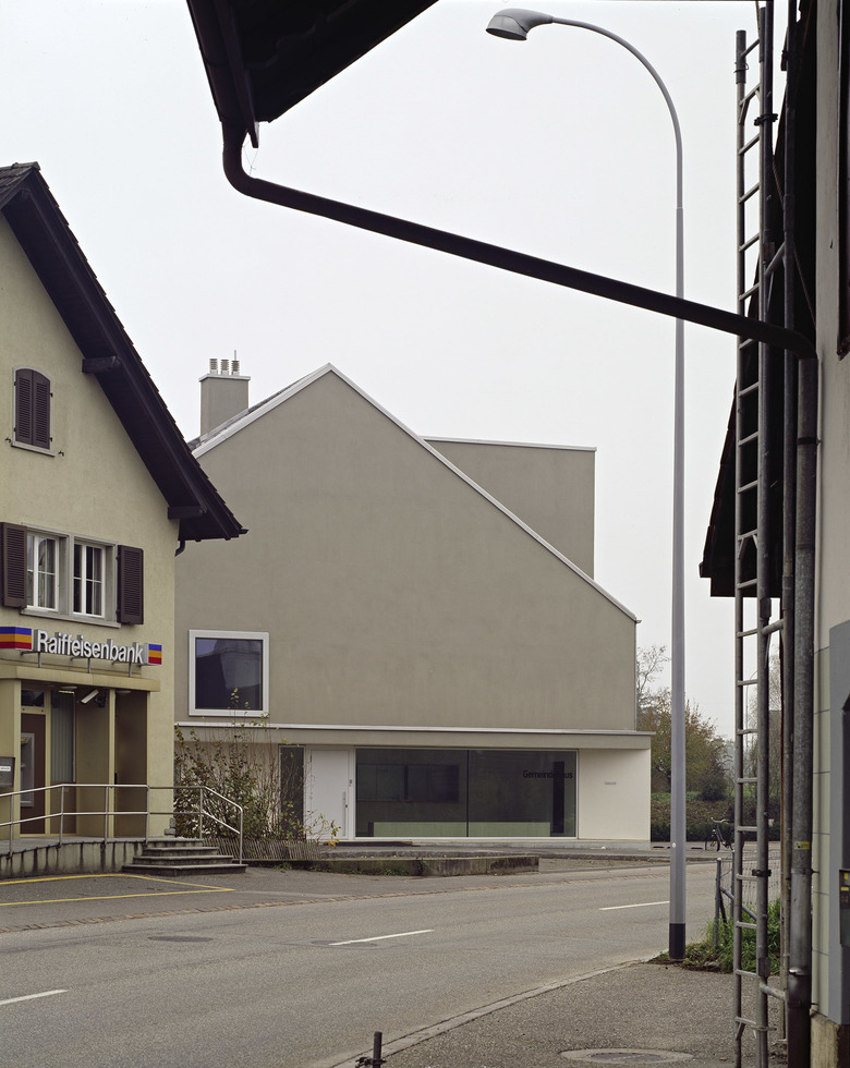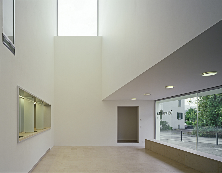 Das neue Gemeindehaus ist entsprechend der massgeblichen Geometrie der Grundstücksparzelle ausgerichtet. Dadurch entsteht zur Strasse hin eine Übereckstellung, welche die besondere öffentliche Bedeutung des Gebäudes auf einfache Weise verdeutlicht. Gleichzeitig entstehen zwei grundsätzlich verschiedene Aussenräume. Sie werden durch die Setzung des Gebäudes und die Ausrichtung des Giebels hierarchisch in einen Gemeinde- und einen Parkplatz gegliedert und erhalten entsprechend eine Haupt- und Nebenfassade. Der Gemeindeplatz, aufgespannt zwischen Gemeindehaus und Raiffeisenkasse dient nicht nur als Hauptzugang, sondern ist auch ein bescheidener öffentlicher Platz geworden.
