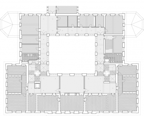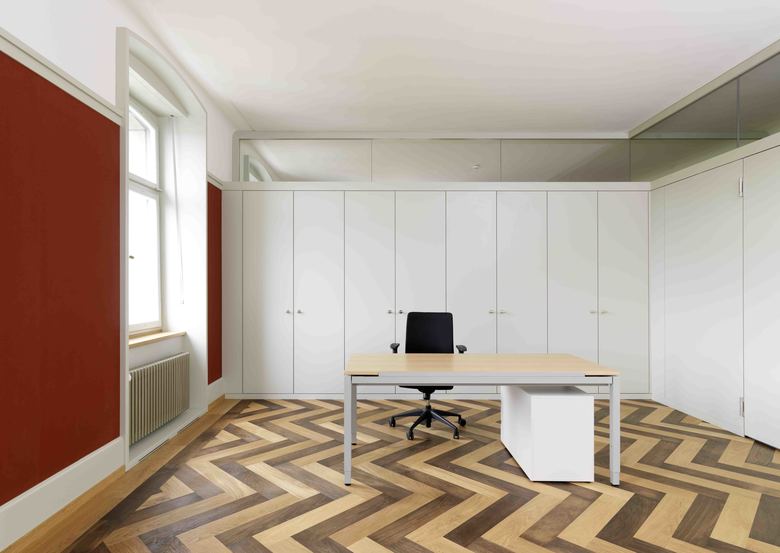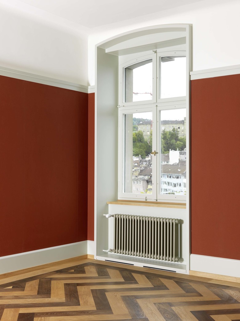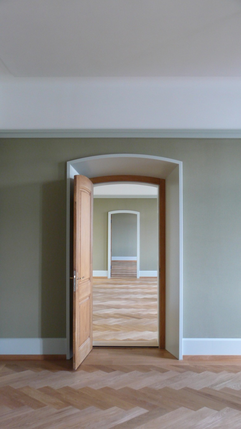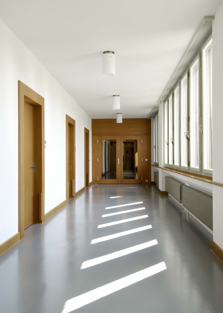 Im Rahmen einer Gesamtkonzeptstudie zum Umbau des Amtshauses I, sind in einem ersten Teilprojekt die Regelgeschosse im Sinne einer Interpretation der ehemaligen „Gewände“ entstanden. Zusammen mit den noch vorhandenen Gull‘schen Bauteilen und deren Materialisierung wurde basierend auf der intensiven Recherche eine angemessene Raumfassung zu einer pragmatischen Interpretation geführt. Die Interpretation nicht mehr vorhandener reichhaltiger Fenstergewände und Holzwerk, unterschiedlicher Wandtäfelungen sowie Bodenbeläge und Stuckdecken, erfolgte in einer reversiblen Überfassung der Haupträume mit robusten Materialien, kräftigen Farben und Kontrasten. Durch die Wahl von „zeit-verwandten“ Materialien und Farben, wie sie auch 1914 zur Anwendung hätten kommen können, wurde die Kohärenz hinsichtlich architektonischer Gestaltung gestärkt.
