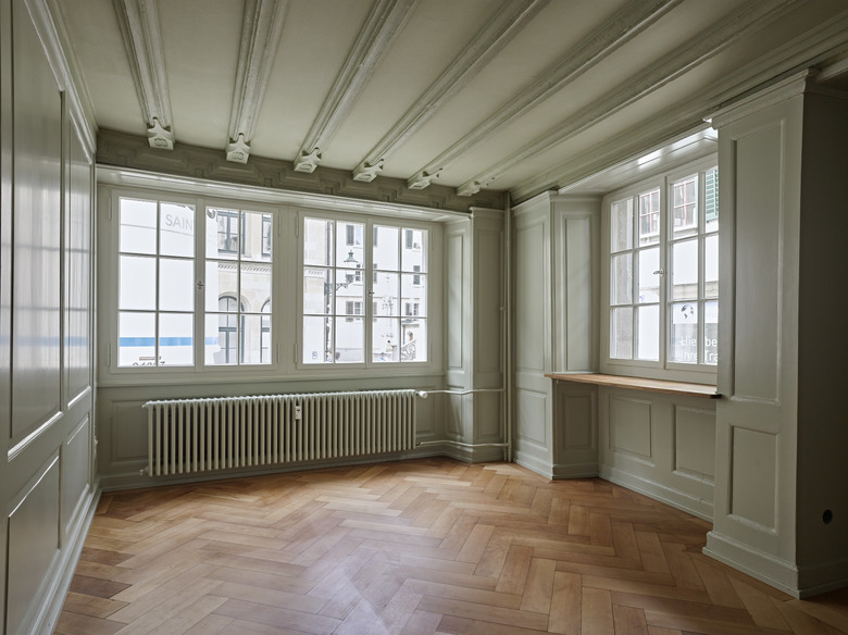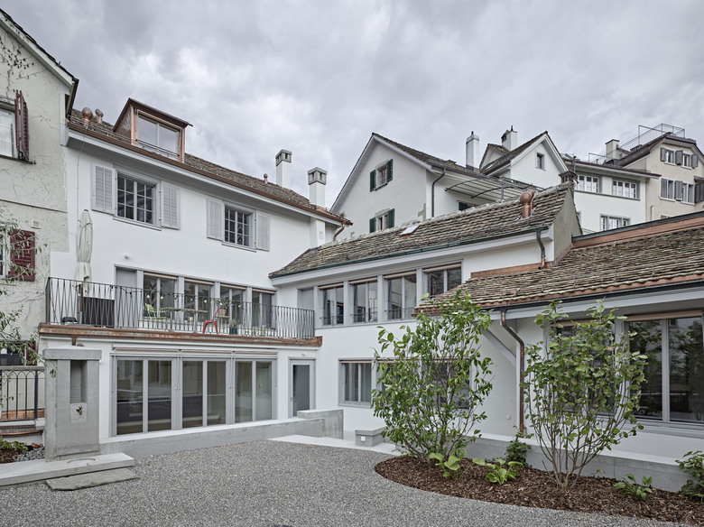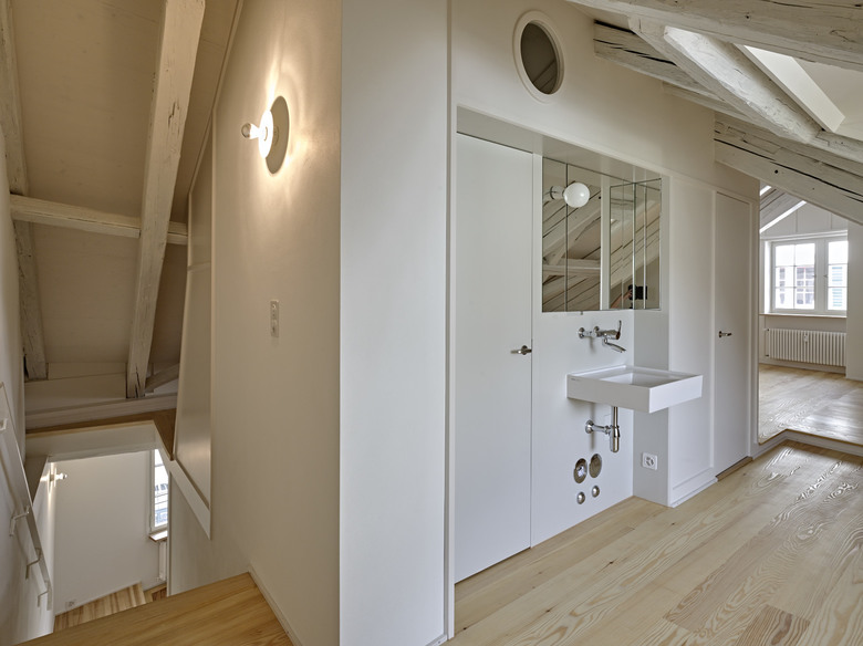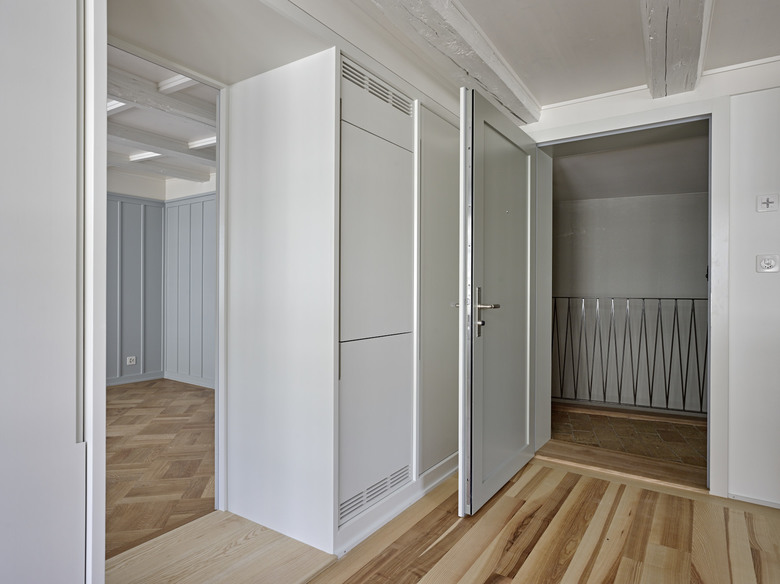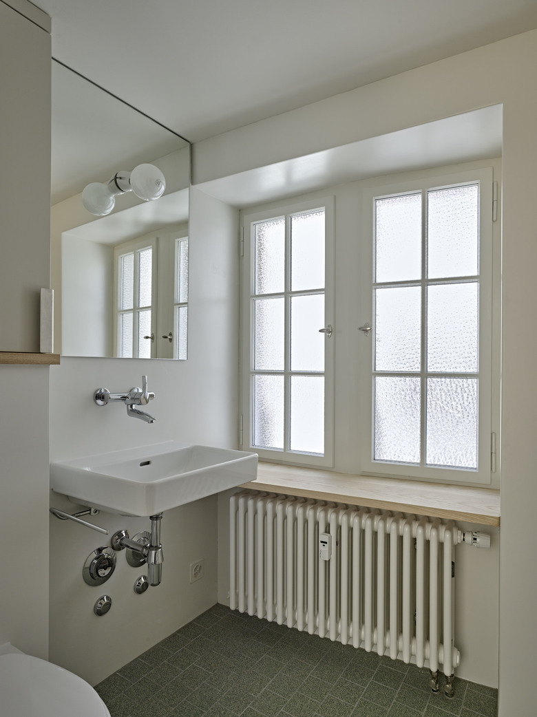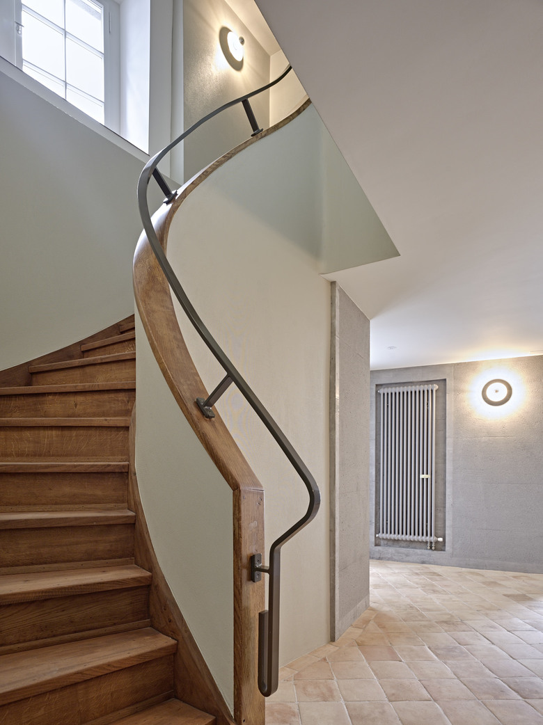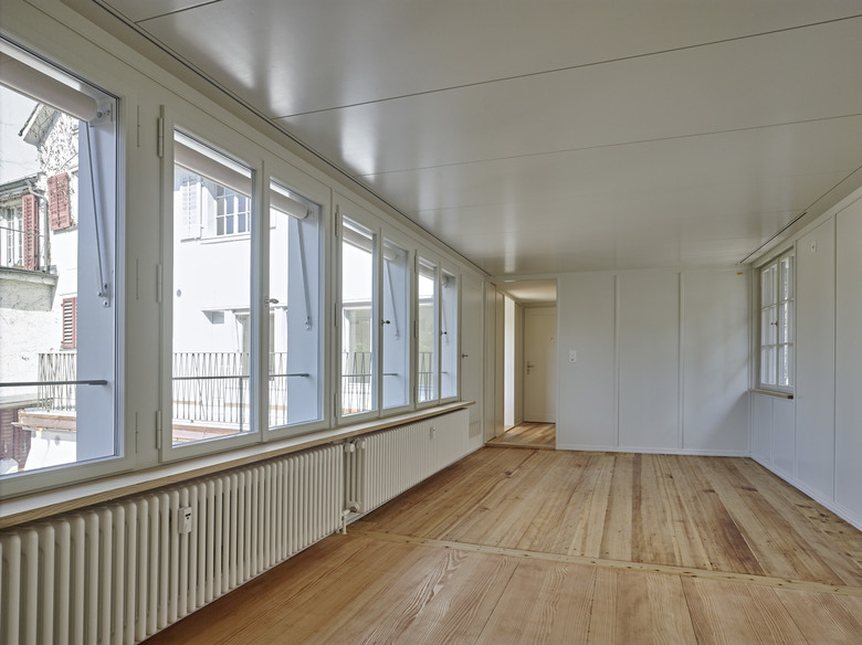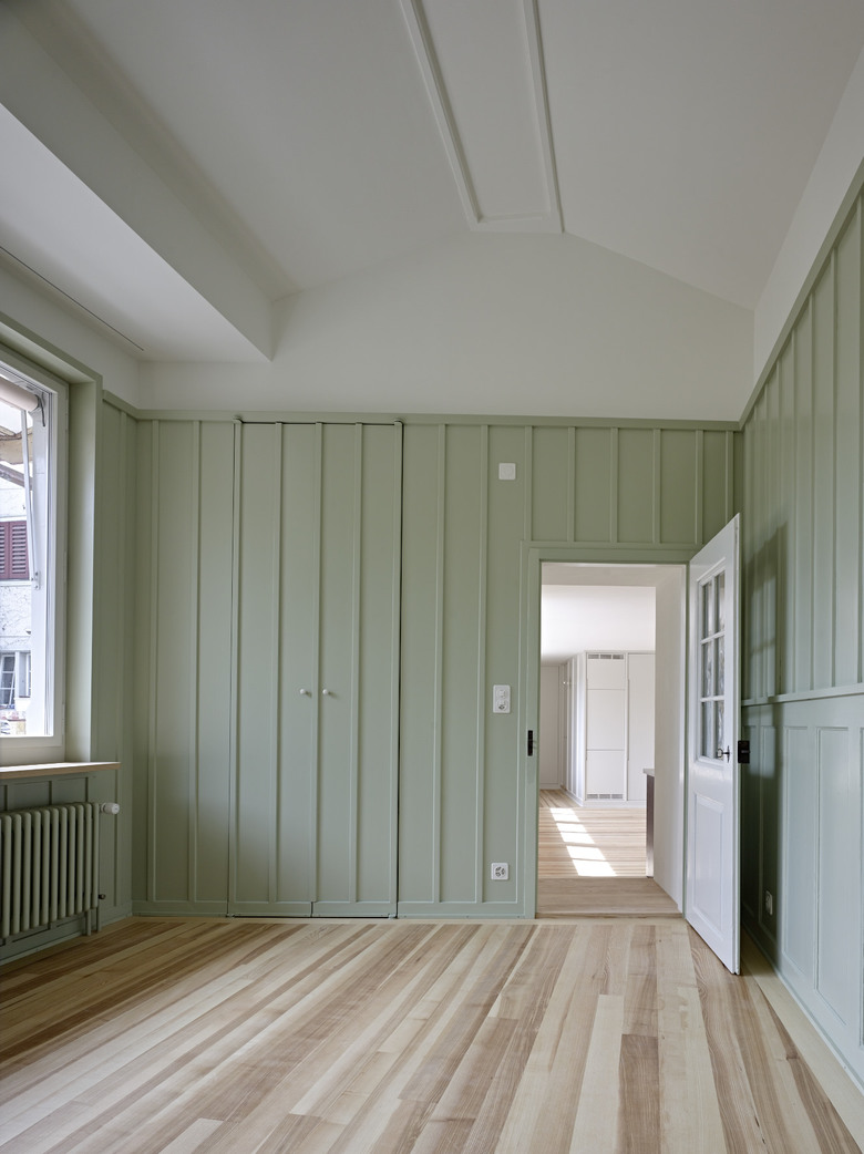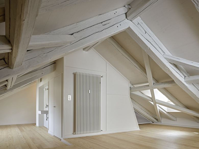 Die vertikale Erschliessung im Gebäude wird beibehalten und die Räume der neuen Wohnungen innerhalb der prägenden Tragstruktur eingebettet. Historisch wertvolle oder gut dimensionierte Räume bleiben bestehen und werden in die neu entwickelten Grundrisse integriert. Die Haupteingriffe konzentrieren sich dabei auf den Einbau der Nebenräume, die entlang der Erschliessung angeordnet werden und auf den Ausbau des Dachgeschosses. Wohnräume und Küchen liegen gut belichtet an den Fassaden; die Nebenräume schaffen Distanz zwischen den Wohnungen. Die Kleinteiligkeit und die niedrigen Zimmerhöhen werden mit räumlich weitläufigen oder geschossübergreifenden Wohnungen kompensiert, um allen Wohnungen bestmögliche Besonnung zu gewährleisten. Zimmer unter den Giebeln können in den Dachraum geöffnet werden, so dass sich die teilweise schmalen Raumverhältnisse auf attraktive Weise entspannen. Der Charme der Wohnungen wird massgeblich von der noch vorhandenen Materialisierung der Raumoberflächen und den Parkettbodenbelägen abgeleitet.
