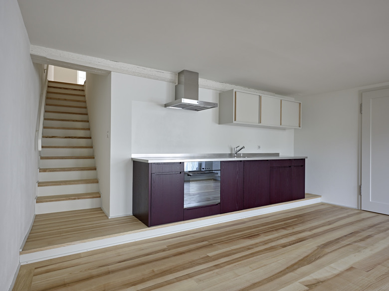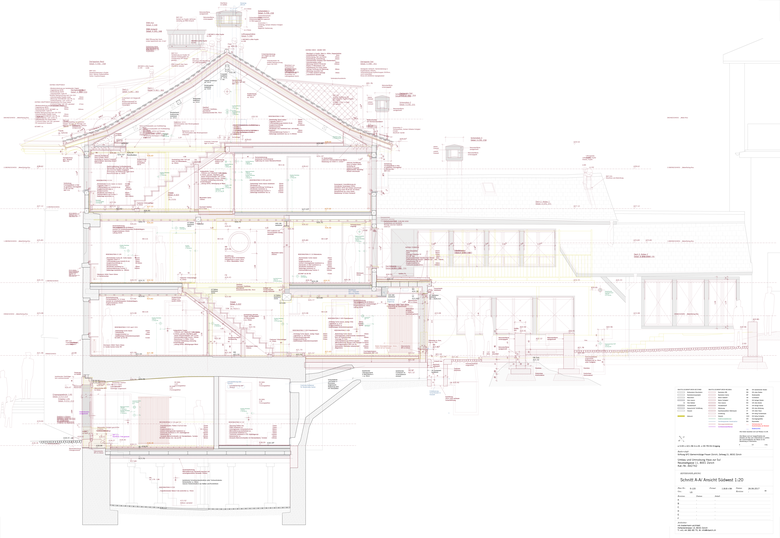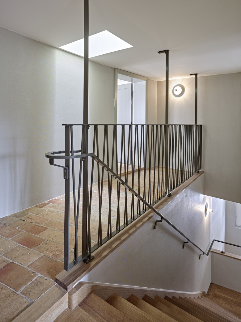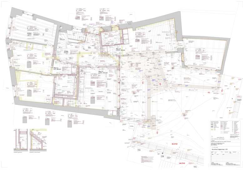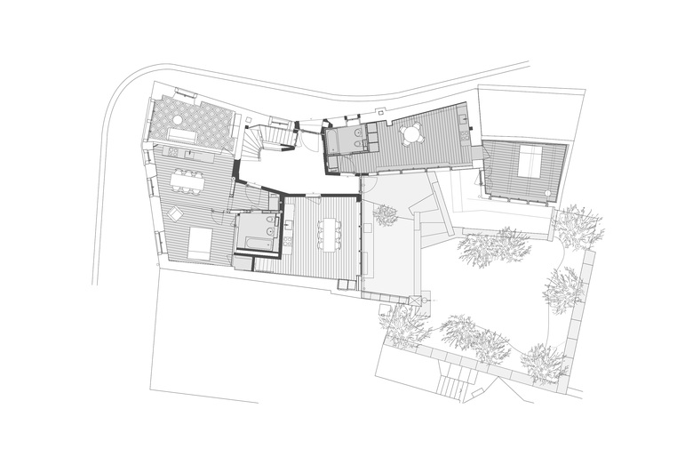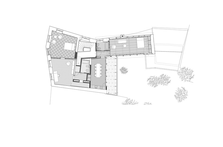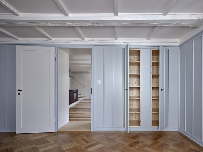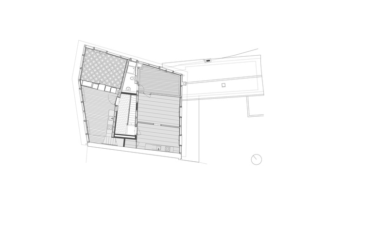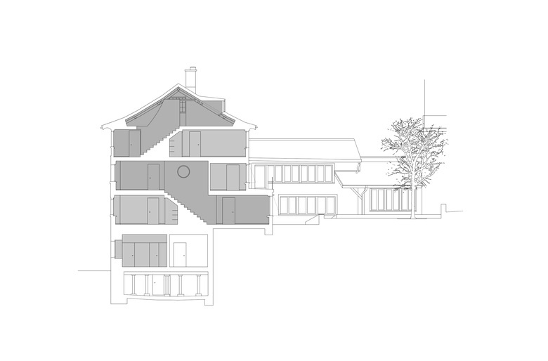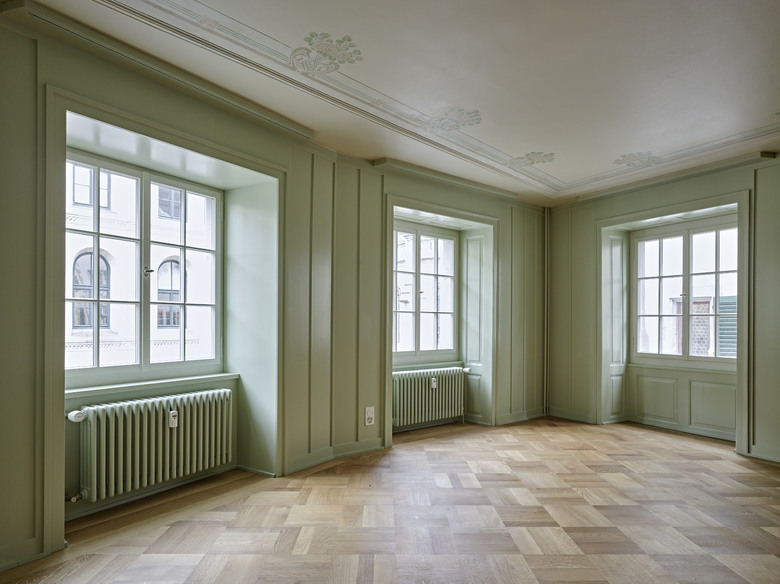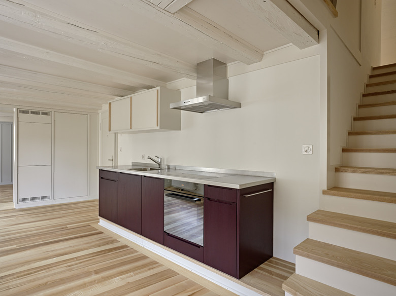 Die vertikale Erschliessung im Gebäude wird beibehalten und die Räume der neuen Wohnungen innerhalb der prägenden Tragstruktur eingebettet. Historisch wertvolle oder gut dimensionierte Räume bleiben bestehen und werden in die neu entwickelten Grundrisse integriert. Die Haupteingriffe konzentrieren sich dabei auf den Einbau der Nebenräume, die entlang der Erschliessung angeordnet werden und auf den Ausbau des Dachgeschosses. Wohnräume und Küchen liegen gut belichtet an den Fassaden; die Nebenräume schaffen Distanz zwischen den Wohnungen. Die Kleinteiligkeit und die niedrigen Zimmerhöhen werden mit räumlich weitläufigen oder geschossübergreifenden Wohnungen kompensiert, um allen Wohnungen bestmögliche Besonnung zu gewährleisten. Zimmer unter den Giebeln können in den Dachraum geöffnet werden, so dass sich die teilweise schmalen Raumverhältnisse auf attraktive Weise entspannen. Der Charme der Wohnungen wird massgeblich von der noch vorhandenen Materialisierung der Raumoberflächen und den Parkettbodenbelägen abgeleitet.