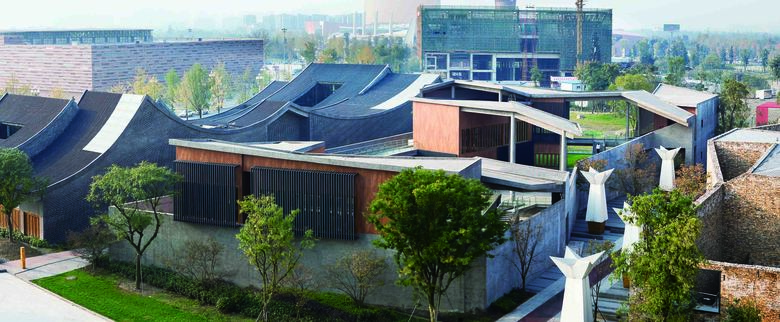 The design was originally conceived as a neat rectangular with a layout of traditional four-courses courtyard. Due to the nature of the skew site, the designs of courtyards are distorted and reshaped accordingly into a free and dynamic flow of forms, as those in traditional Chinese gardens. Through water pond, the continuously floating roof is absorbed and becomes part of flow of the courtyards.