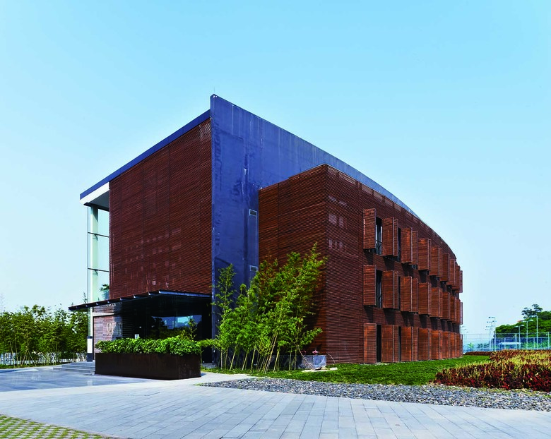 A group of independent,curved lines is a logical extension of the existing main building. A line of multiple cores is simply a rebellion against the single core.It brings in views with many angles and is easily appreciated through the path.