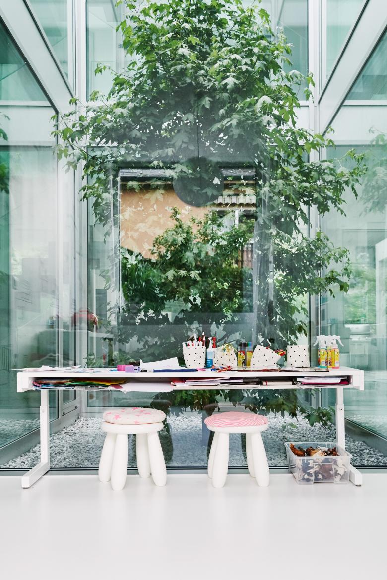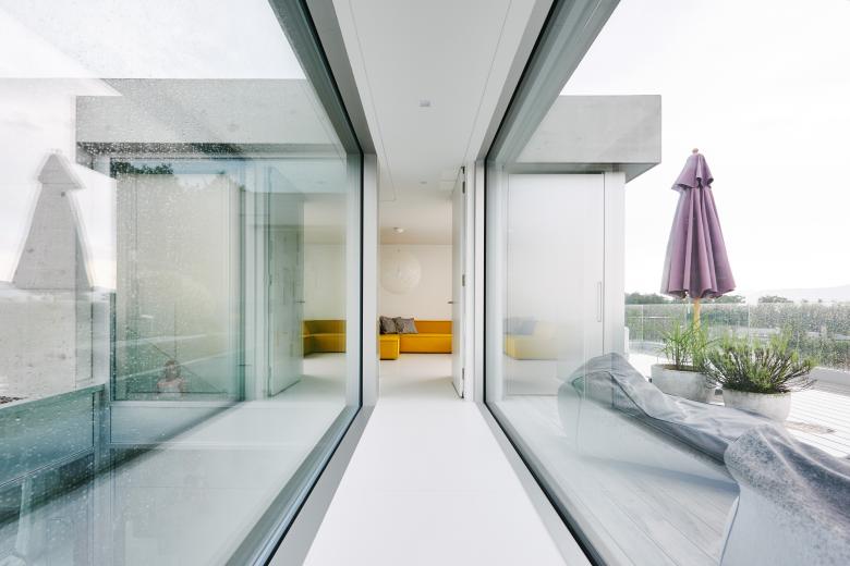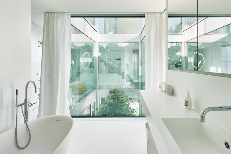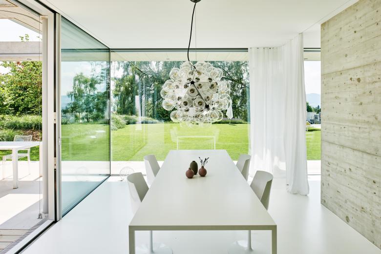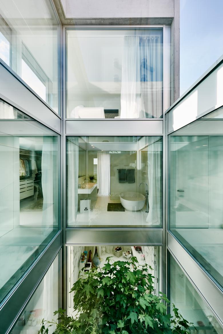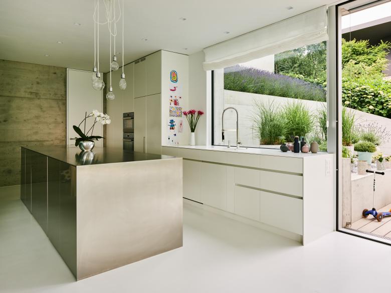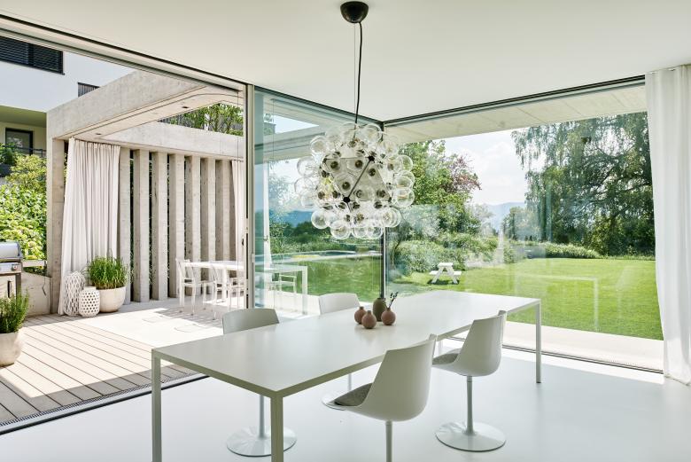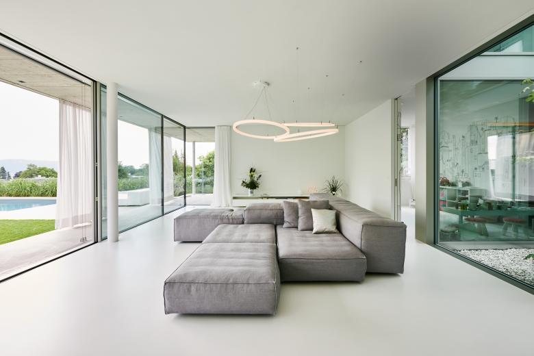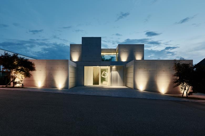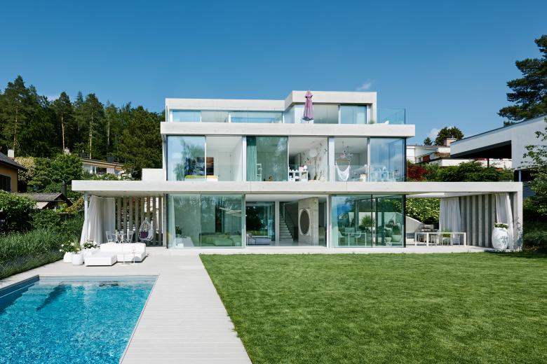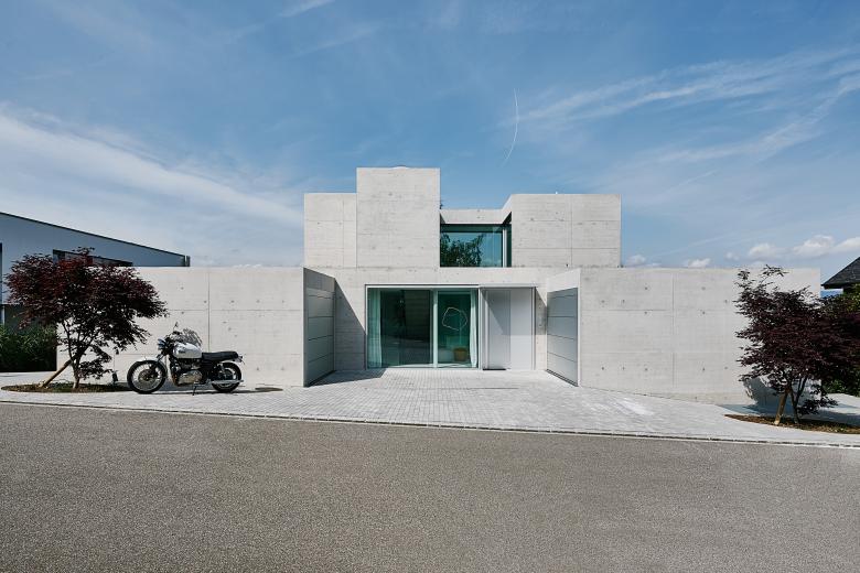 Die Villa für eine junge Familie befindet sich in einem für die Zürcher Seegemeinden typischen Quartier mit Ein-und Mehrfamilienhäusern in unterschiedlichen Baustilen. Das in hellem Sichtbeton erstellte Gebäude erscheint von der Zugangsseite her als eine Art skulpturale Schichtung von Kuben, welche sich um einen offenen Hof gruppieren. Zur Strasse hin gibt sich der Baukörper zwar geschlossen, empfängt Besucher aber über die einladende Geste des gefassten Vorplatzes, von welchem über die verglaste Eingangsfront Einblicke ins lichtdurchflutete Innere gewährt werden. Gartenseitig, nach Südwesten hin orientiert, öffnet sich das Haus mittels grosszügig verglasten Fensterfronten und gibt den Blick auf die Albiskette und vom Attikageschoss gar auf den Zürichsee frei.