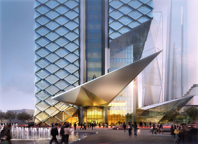Dancing Dragons, a pair of mixed-use skyscrapers, stands proud in Seoul’s new Yongsan International Business District. A strategy of articulating the shingled facades produces an iconic appearance from a distance and generates a unique visual experience of the dragon-scale building skin. Playing on the building’s identity, micro-sized LEDs at the fritted glass planes allow the building to ‘breathe’ in different colors for special events, changing from fire-like amber hues to cool, blue-green tones.