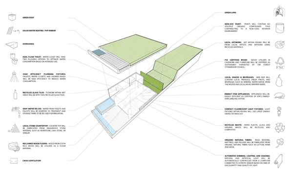 The design logic is generated from a reverence for the land and awesome presence of the site. Sustainability is imbued throughout the life cycle of San Silencio-where intelligent planning provides innovative opportunities for energy and resource conservation, up-cycling (as opposed to re-cycling), waste, and healthy building initiatives-- where ecology and sustainability set forth even greater guilt-free luxury, not self denial. The project will synergize with the environment-- harvesting the power of earth, wind, and sun in a discrete; yet highly efficient manner. Passive means of cross ventilation, large overhangs, and proper sitting allow the project to minimize energy consumption and maximize comfort healthy living. Great care has been given to utilizing local materials as well as various water conservation measures for both human and site irrigation (beyond super efficient fixtures--dual flush toilets, low flow showers, etc.)-establishing a relatively closed system of harvesting rain water in subterranean cisterns and re-harvesting grey/ black water though a living machine of botanical and biological nature. Means of nourishment (food for both human and land) will be obtained locally and supplemented by on-site gardens and systems. All systems and services will be completely integral to the design (inclusive of hydrogen powered vehicle paths and storage).